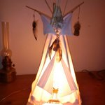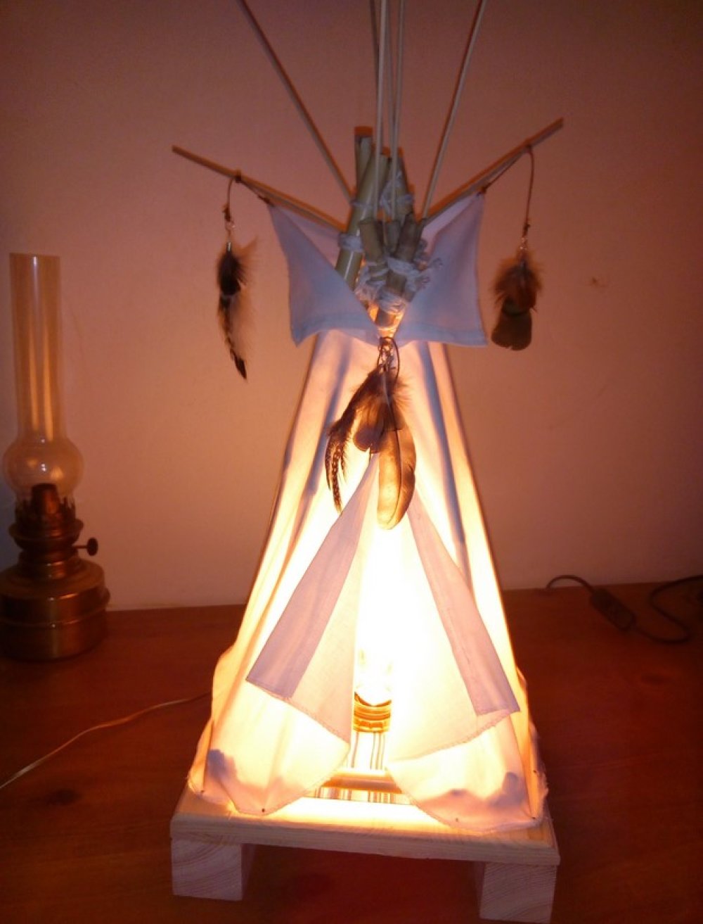 Je vous présente ma lampe Tipie Indien entièrement réalisée à partir de bois recyclé, de tissus de coton blanc recyclé, de bambou récupéré (ils ont été utilisés pour maintenir nos plants de tomates durant l'été), de corde de coton naturel blanc, ainsi que de plumes naturelles. Au centre j'ai fixé une douille normes C.E adaptée pour réceptionner les ampoules E27 (ampoules à vis à gros culot). La lampe est équipée d'une grosse ampoule LED E27 BLANC CHAUD.