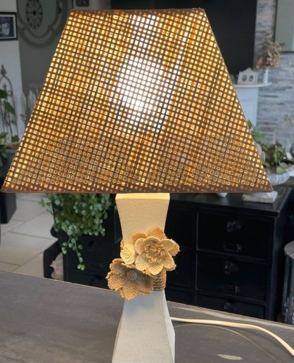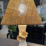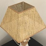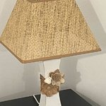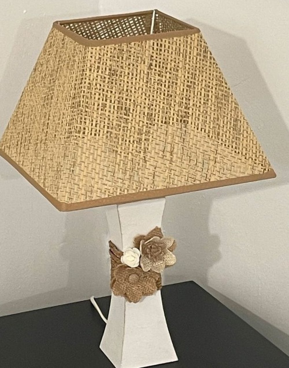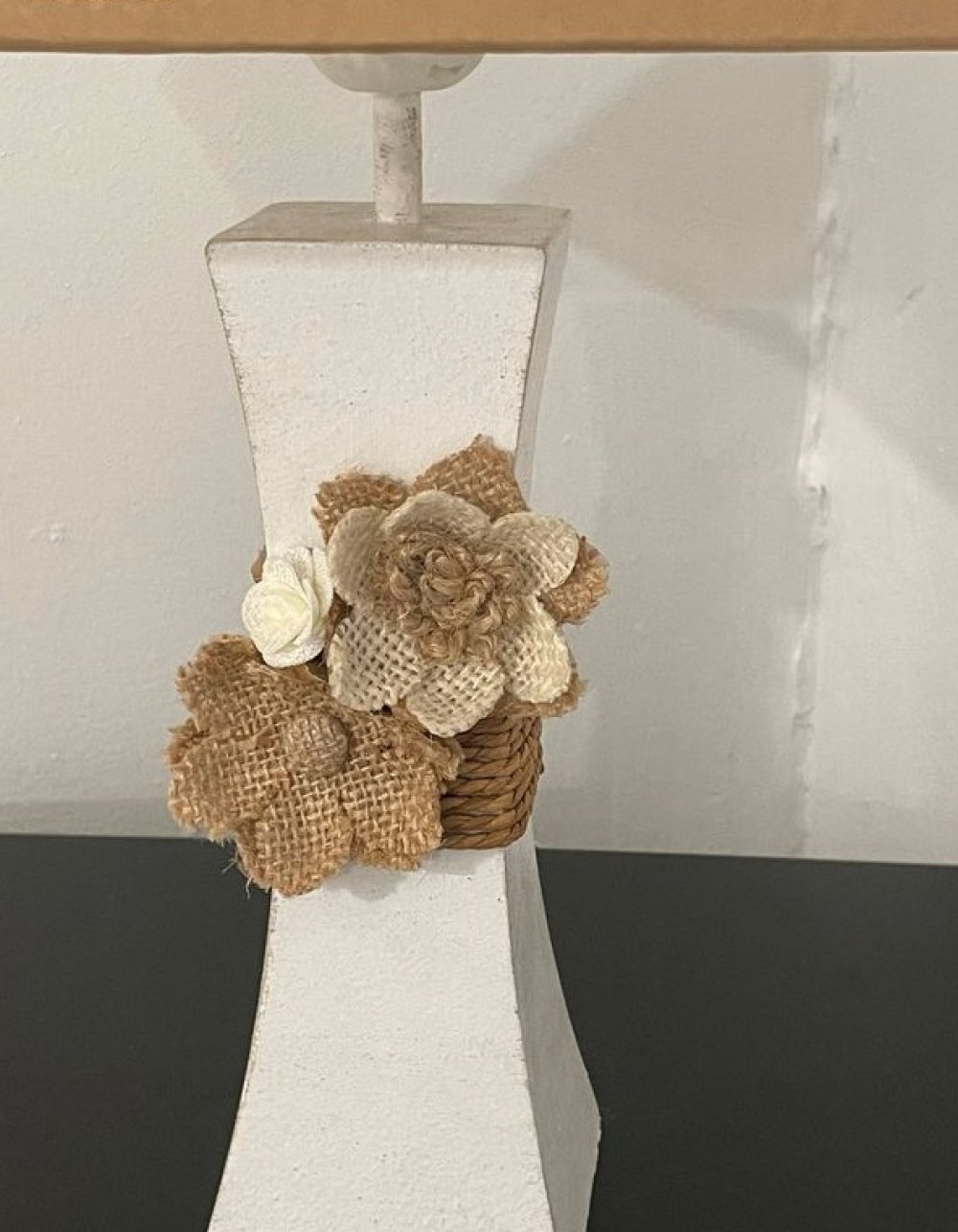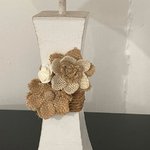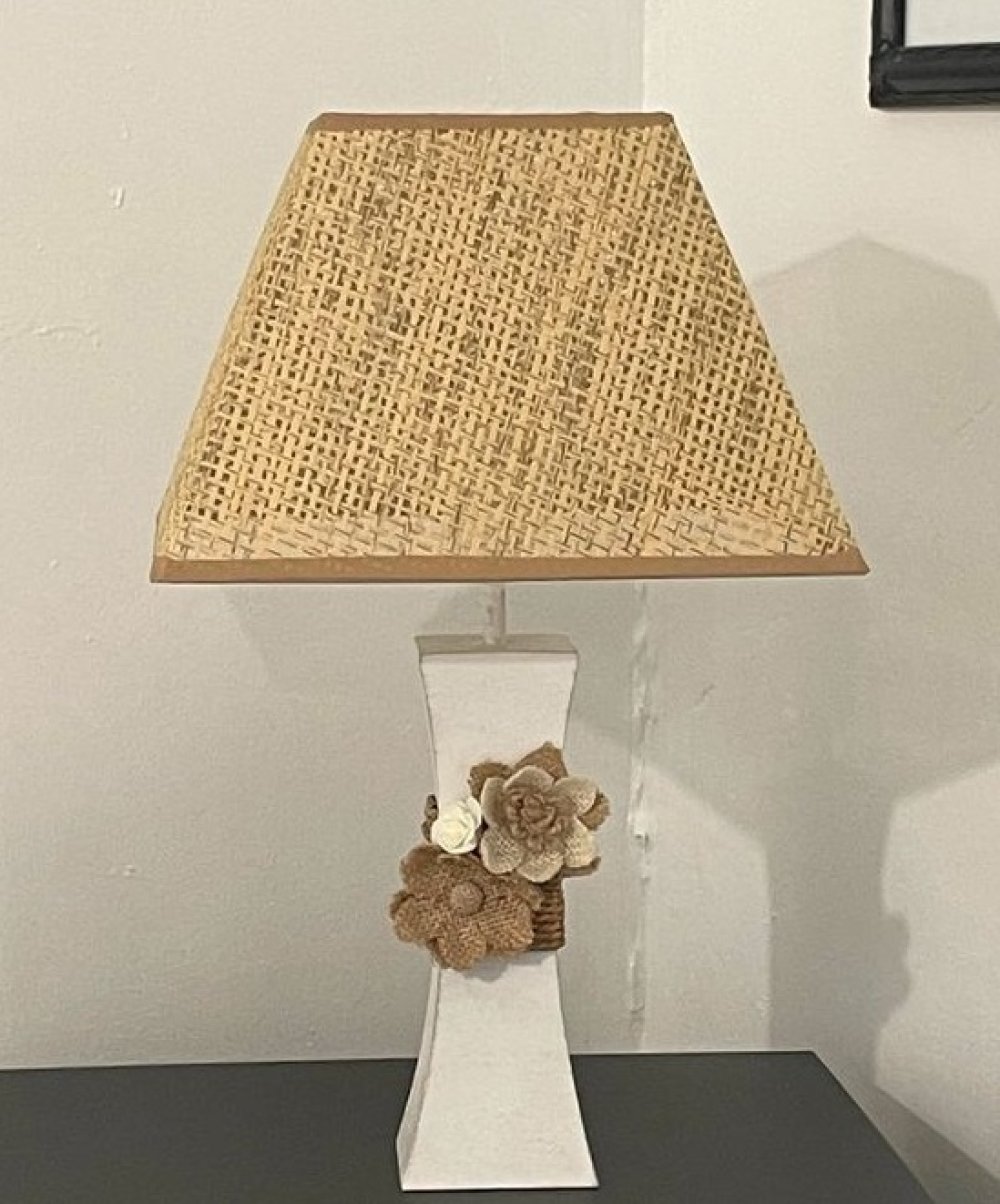 Lampe composée d’un pied en métal blanc, très légèrement patiné en taupe et décoré d’une ficelle et de fleurs.