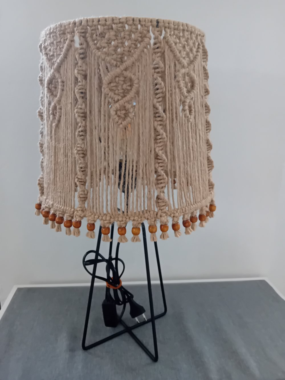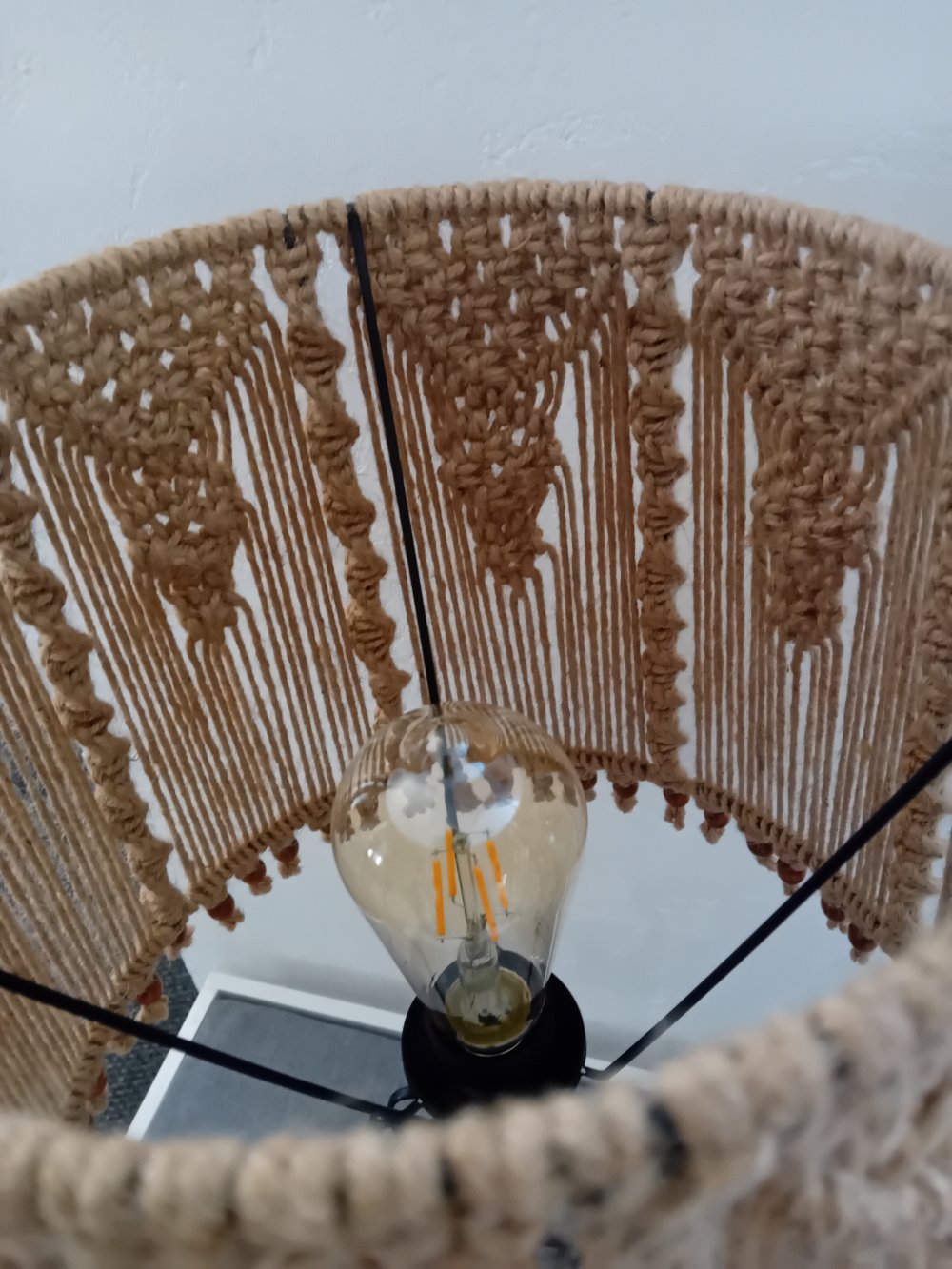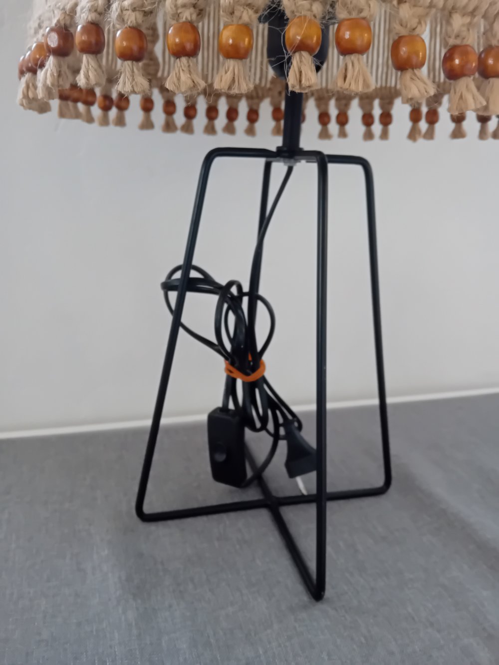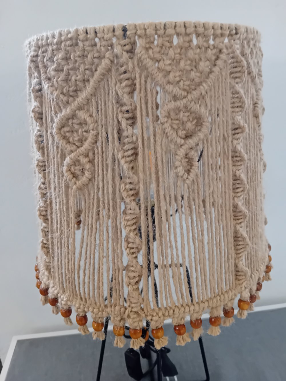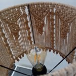l ́abat-jour  également en métal noir et tissé en macramé corde de jute.