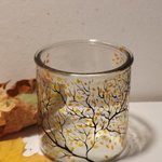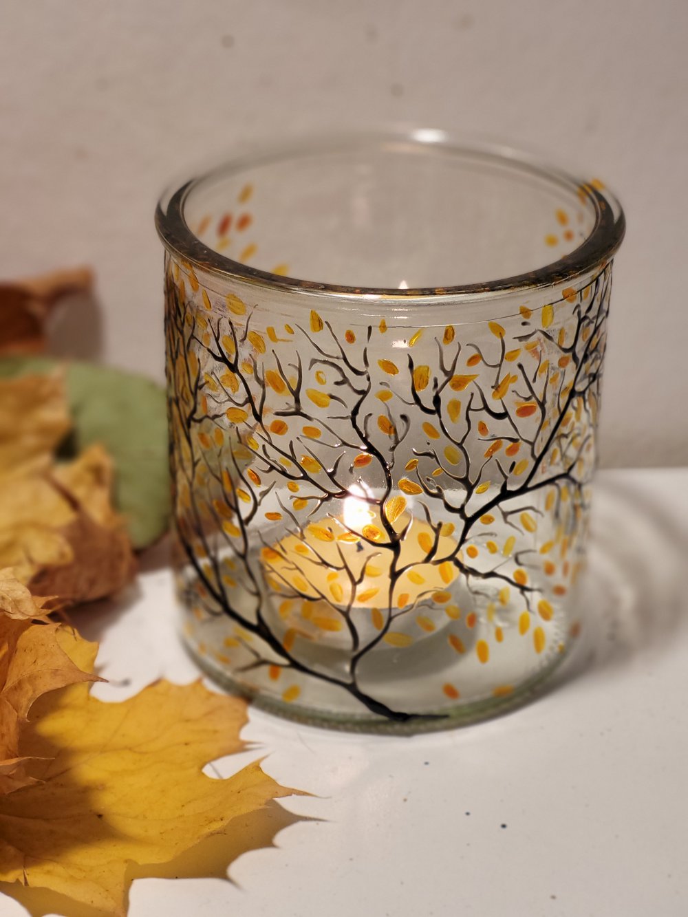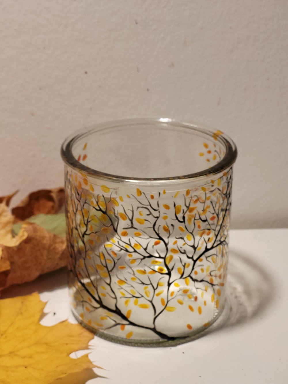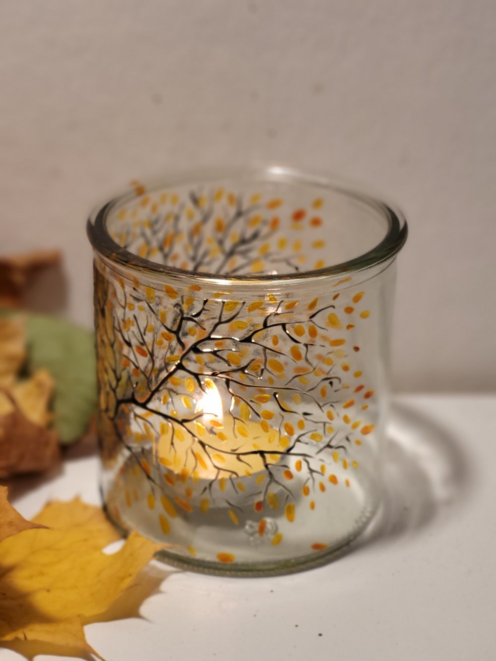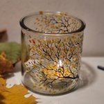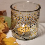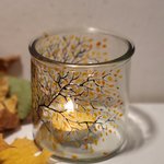 Photophore en verre peint d’un motif style arbre de vie avec un feuillage jaune, orange, doré