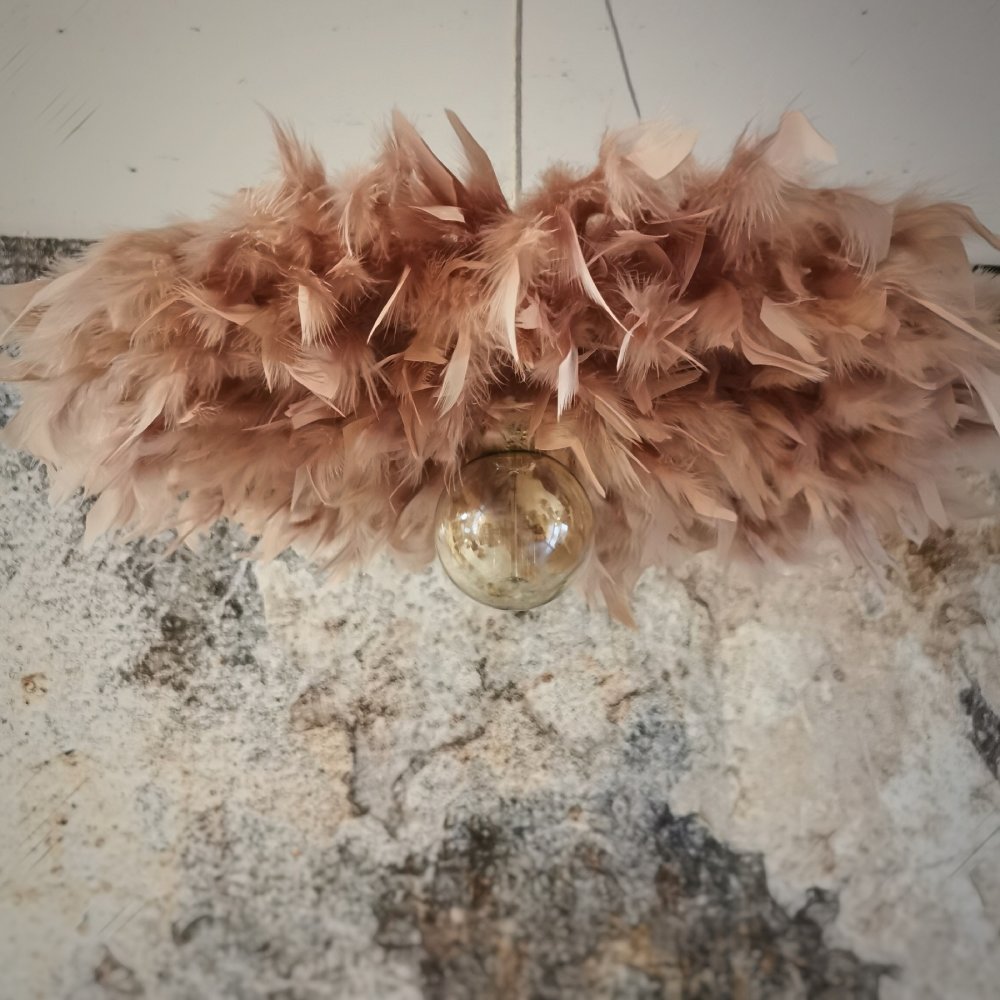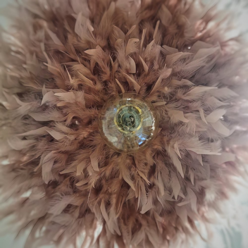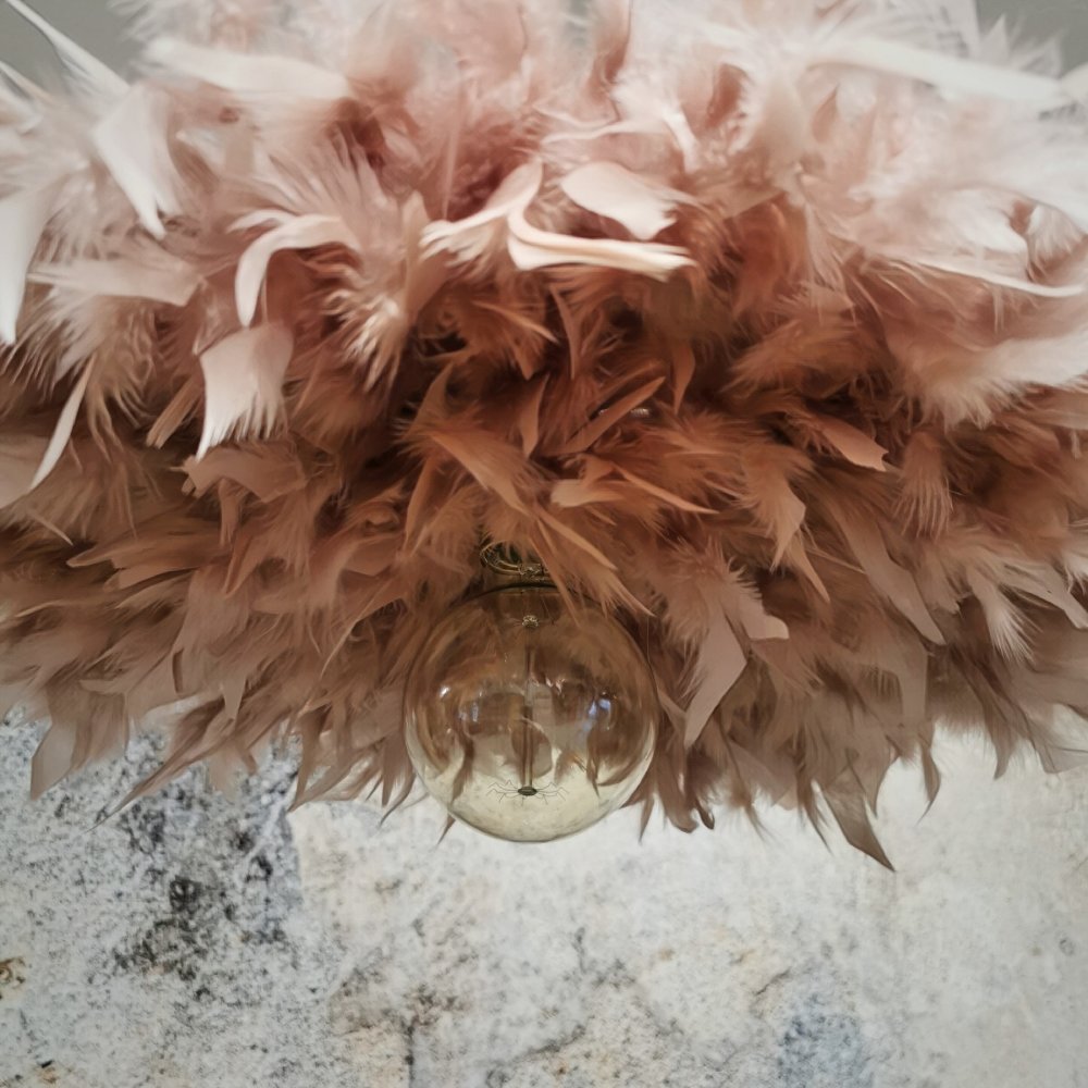 Suspension fleur en plumes vieux rose, entièrement façonnée à la main. Son diamètre d’environ 60 cm apporte une touche poétique et vaporeuse à votre intérieur. Une pièce unique qui crée une ambiance douce et chaleureuse.