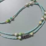 Réalisée avec soin, elle se compose de petites perles colorées (turquoise, dorées et blanches) et de perles lettres formant le mot LOVE.