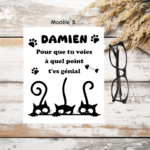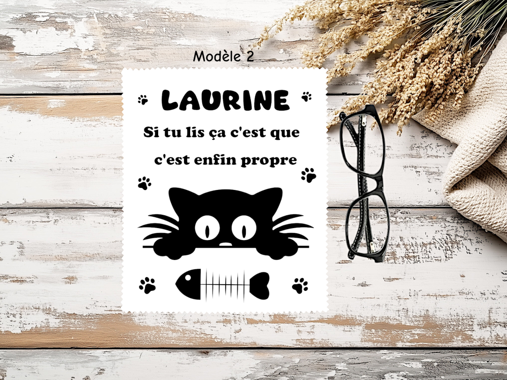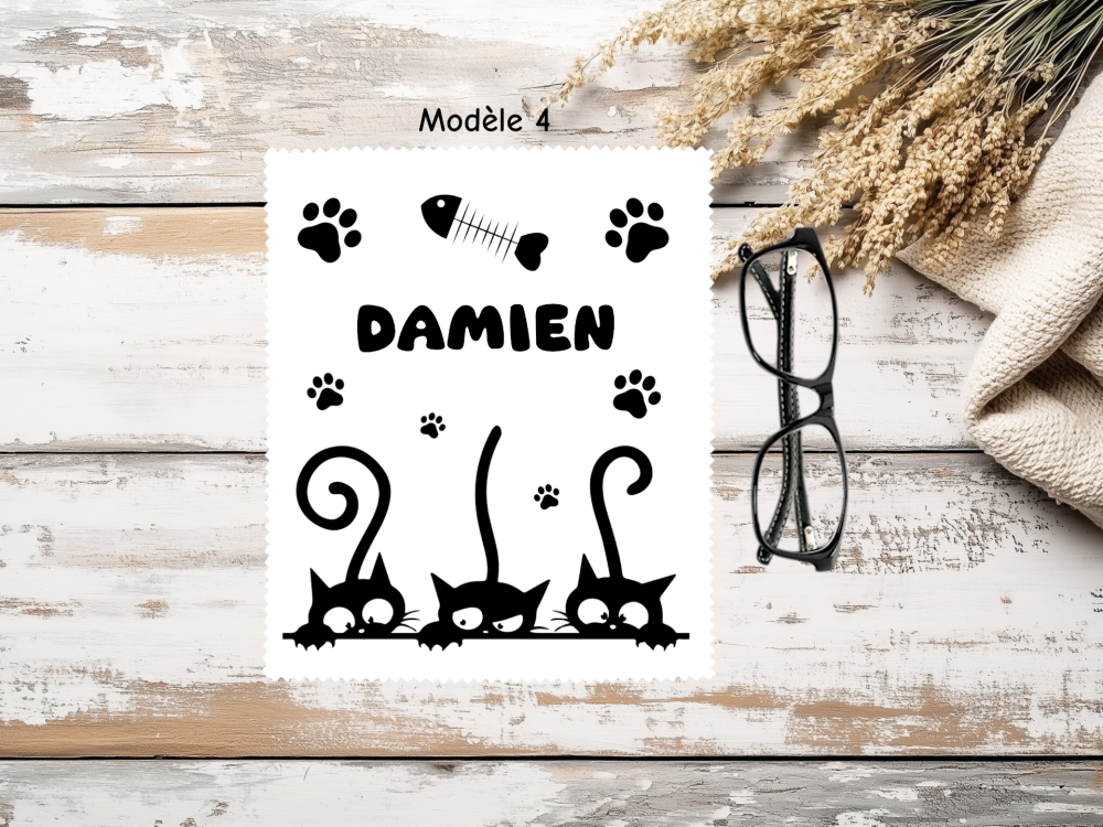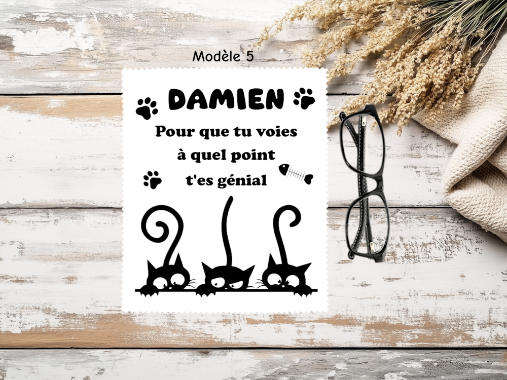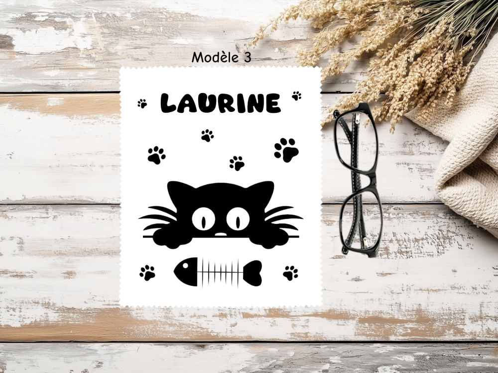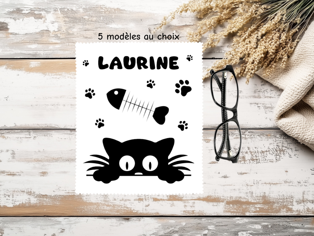 Essuie-lunettes en microfibre douce, personnalisable avec un design chat. Nettoie efficacement lunettes, écrans et surfaces délicates sans laisser de trace. Un accessoire original, pratique et parfait pour les amoureux des chats.