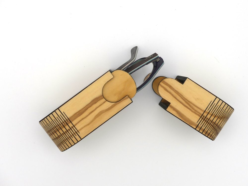 Essences de bois utilisées : étui en olivier d'Italie, marqueterie en olivier d'Italie et loupe de camphrier.