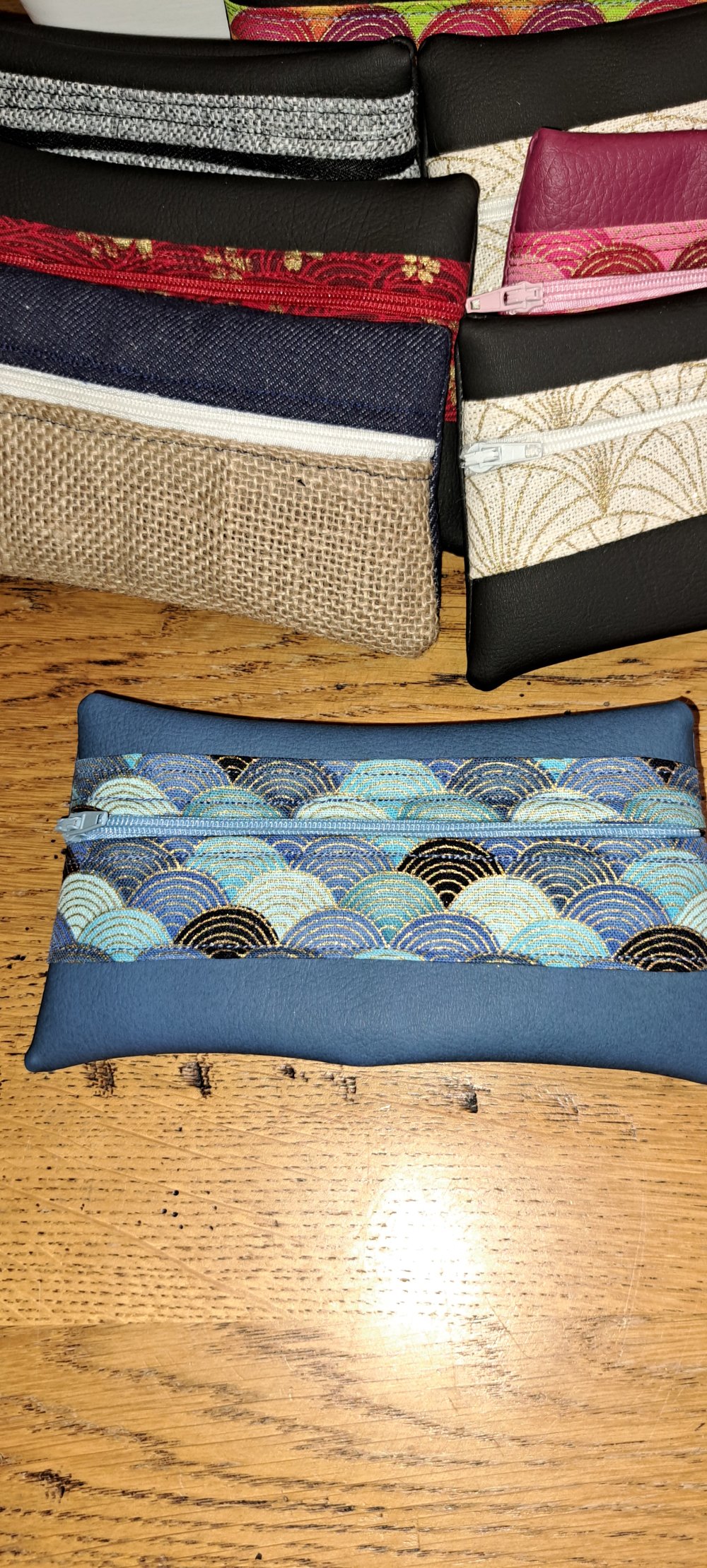 étui lunettes en similicuir et tissu bleu et or avec fermeture éclair