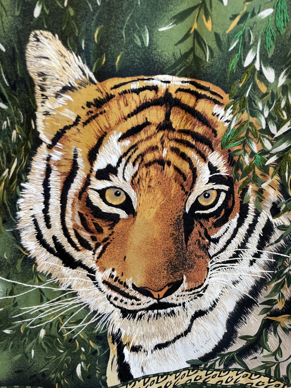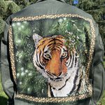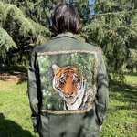 Veste militaire remise en circuit pour lui donner une seconde vie grâce à de la broderie main réalisée sur un tissu imprimé.