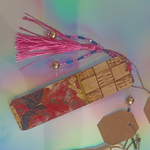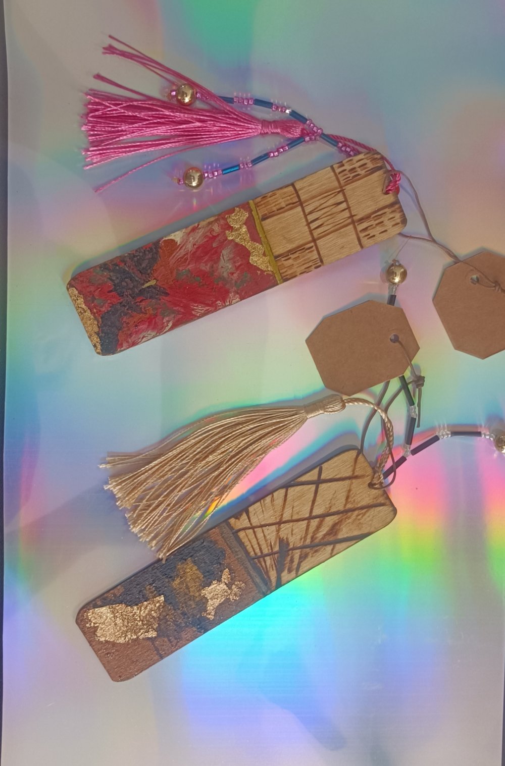 marque page en bois gravé et peint en rouge avec feuille D'OR