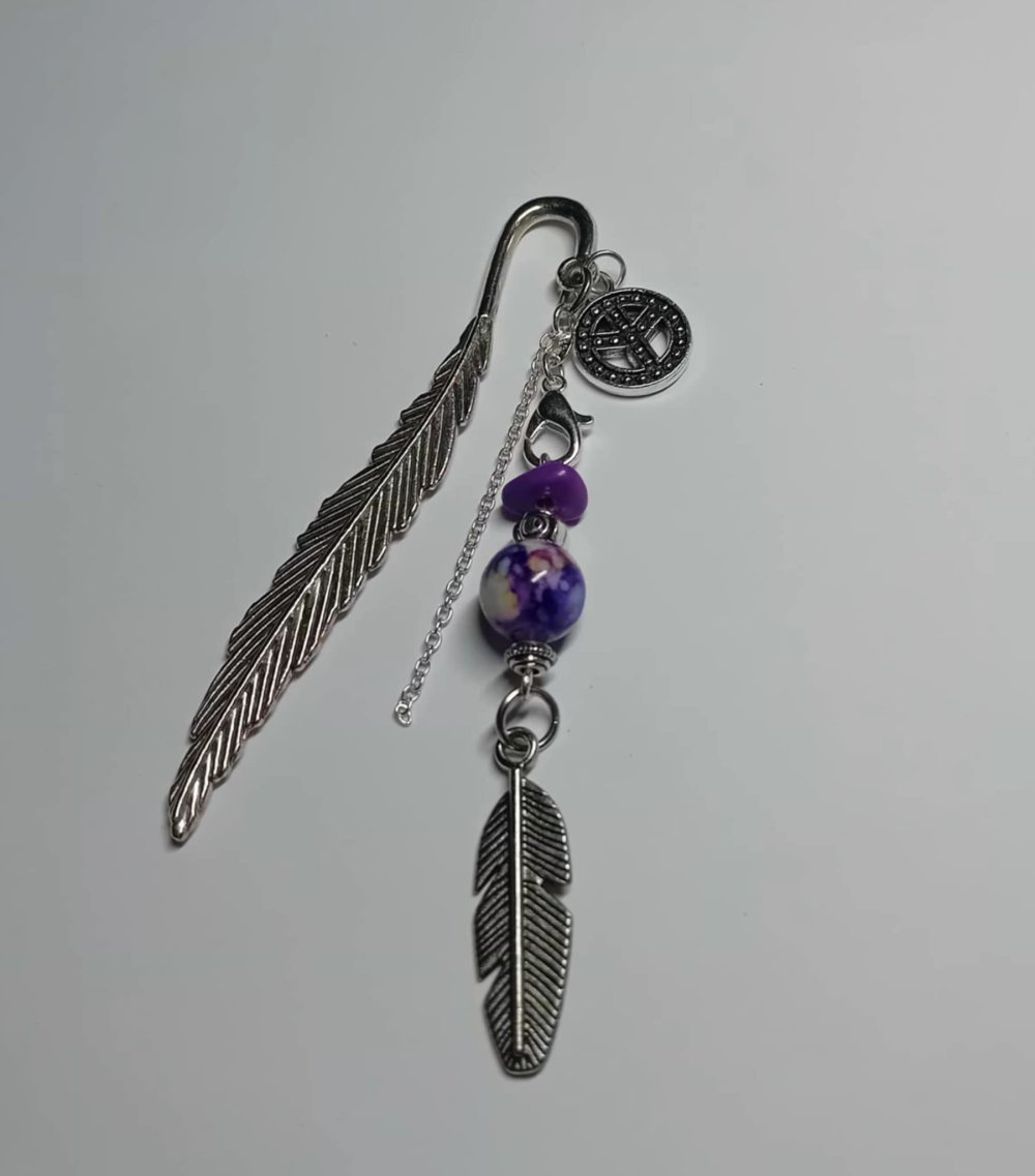 Pendentif Plume & Paix : Une breloque "Peace & Love" en haut du crochet et une plume assortie en bas, symbolisant la liberté et l'harmonie.