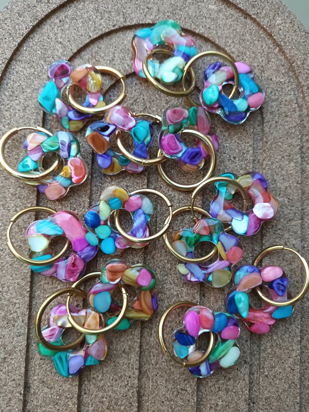 Boucles d'oreilles fleurs, en résine et cailloux colorés