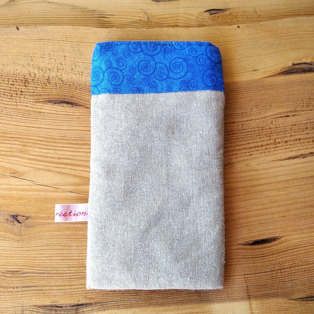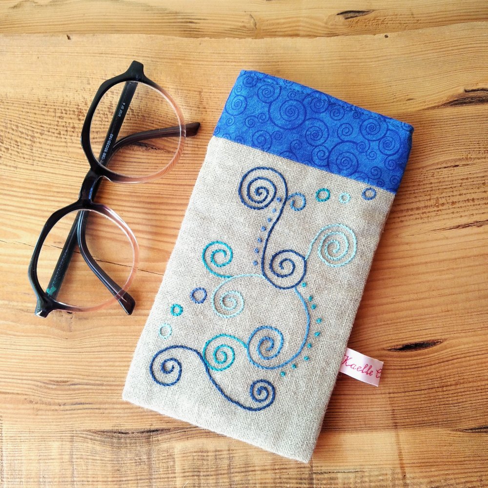 J'ai confectionné cet étui à lunettes en lin naturel écru, agrémenté d'une cotonnade imprimée d'arabesques bleu foncé sur fond bleu. J'ai utilisé cette même cotonnade pour faire la doublure intérieure.