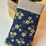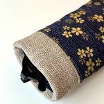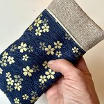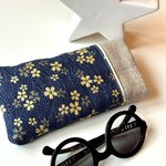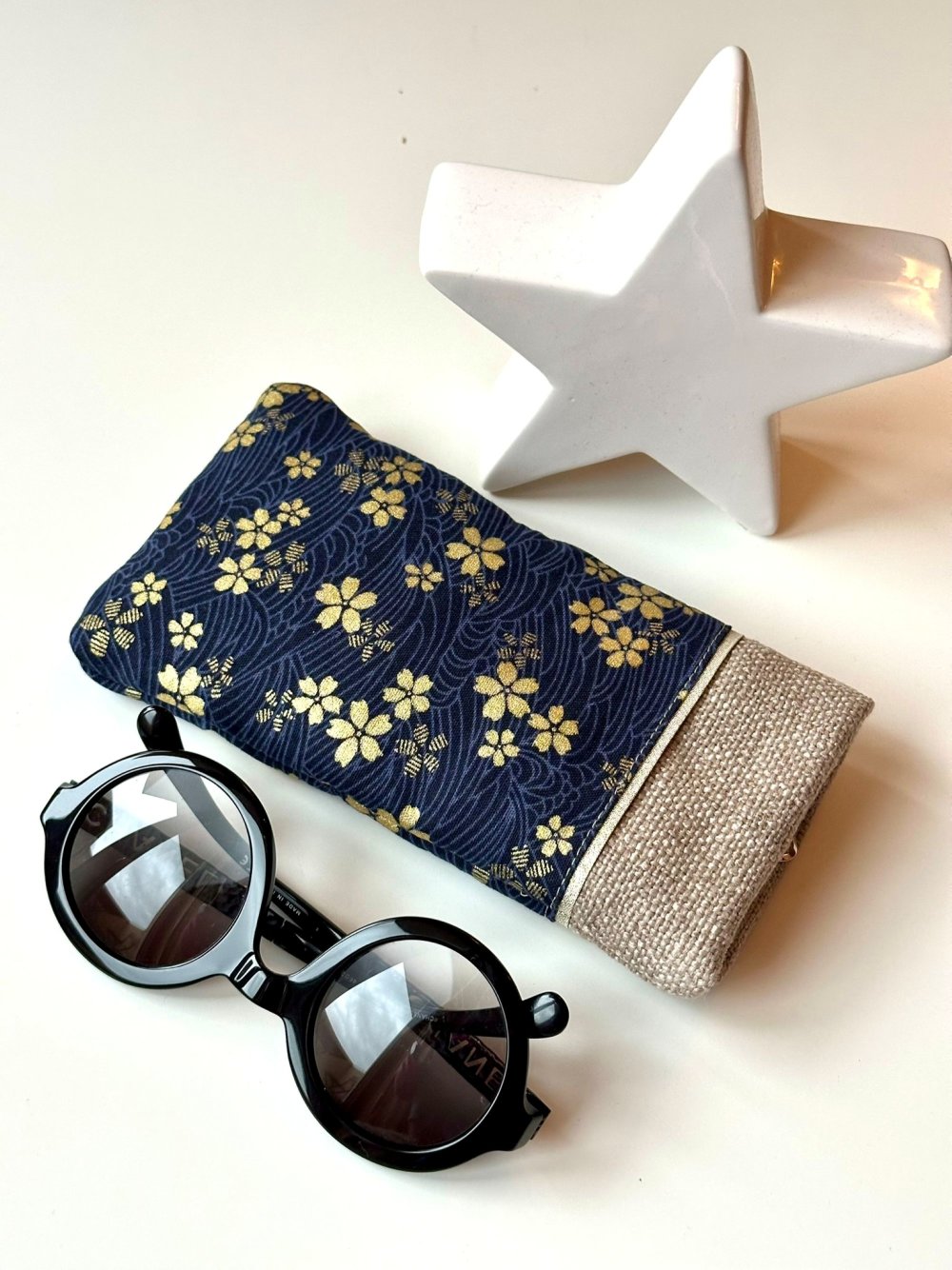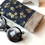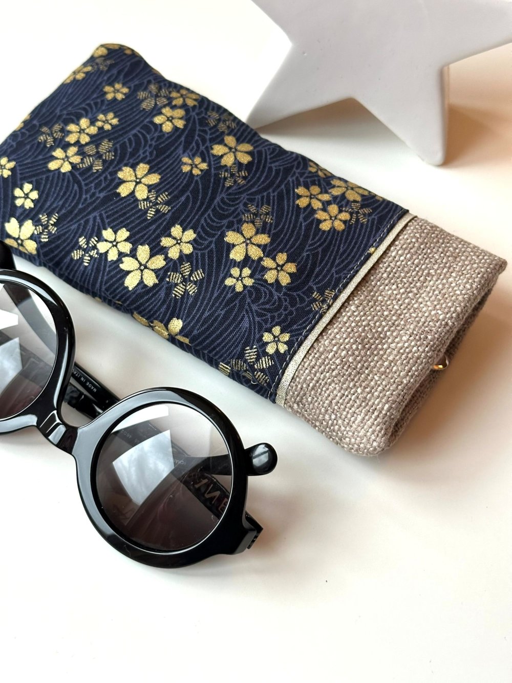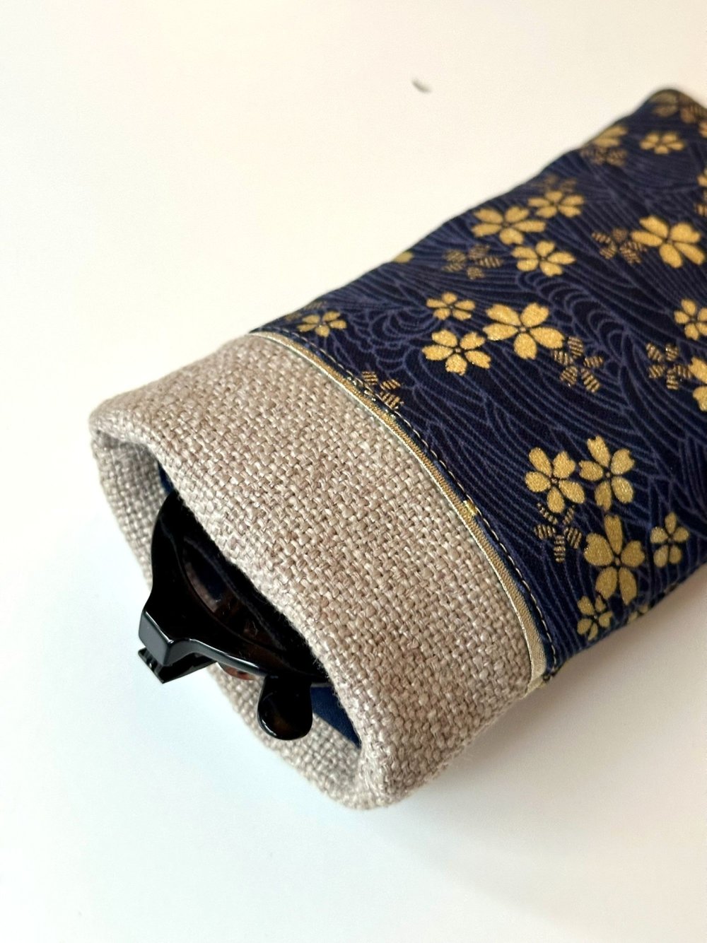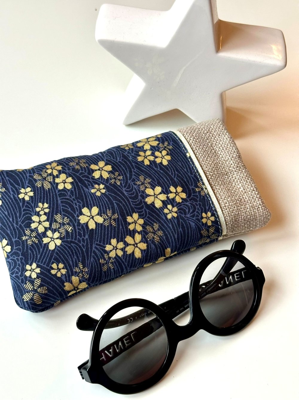 Etui à lunettes en tissu japonais bleu marine et doré, et en lin avec liseré doré et fermoir aimanté, pour toutes tailles de lunettes.
