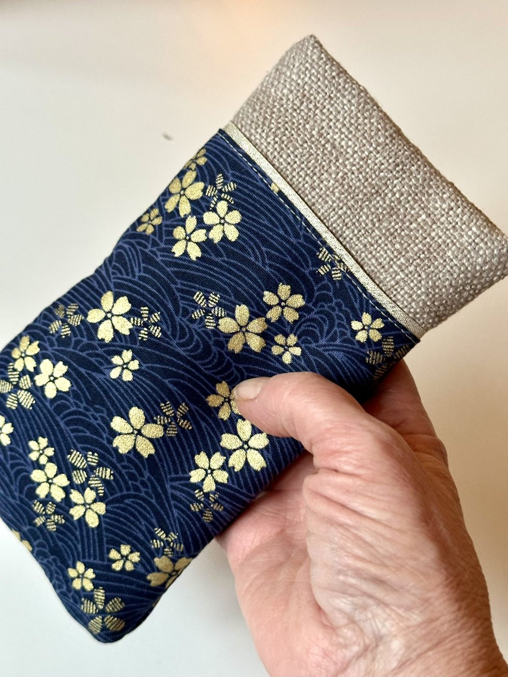 L' étui à lunettes idéal en tissu japonais Sakura bleu et lin beige, qui protégera vos lunettes dans votre sac à main, mais sans occuper la place folle des étuis rigides bien encombrants!