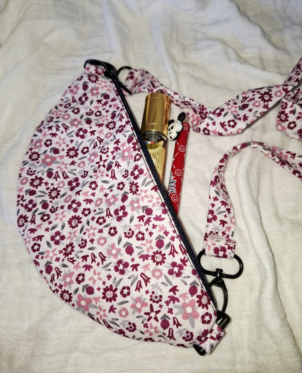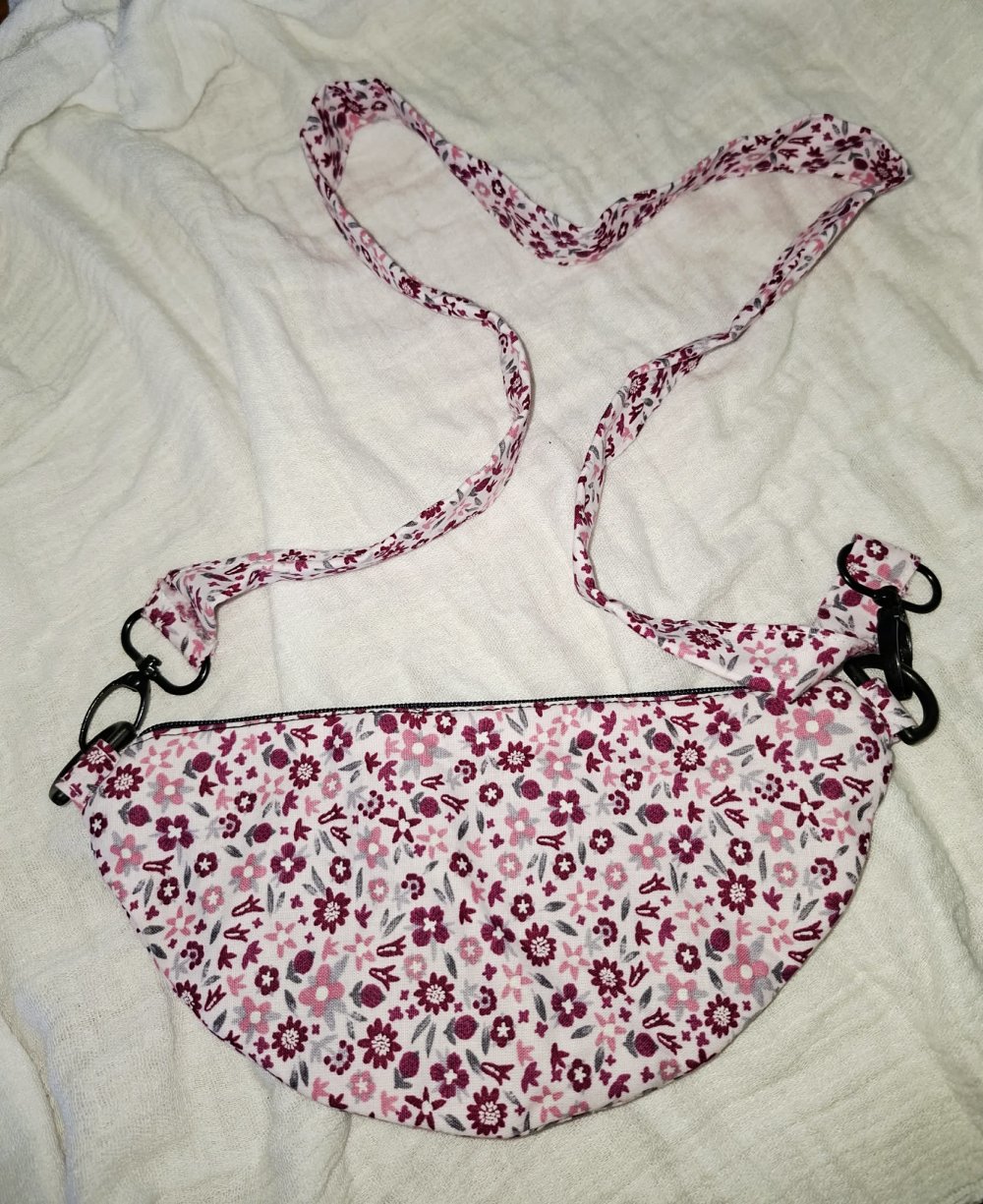 Ce sac bandoulière compact au design demi-lune est confectionné dans un tissu clair orné de petites fleurs roses et mauves, apportant une touche douce et féminine à n’importe quelle tenue. Sa fermeture zippée protège vos effets personnels tandis que sa sangle permet un port confortable à l’épaule ou en travers du corps. Léger et discret, il est parfait pour garder sur vous l’essentiel comme l’argent, des cartes ou de petits objets lors de sorties ou de promenades.
