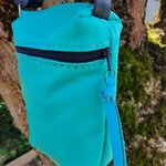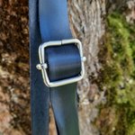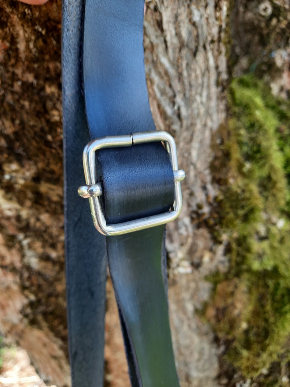 Bandoulière en cuir teintée bleue marine et réglable en longueur.