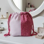 Pochon en coton imprimé et uni certifié Oeko-Tex avec doublure polyester. Fermeture par un cordon coulissant de couleur fuchsia.