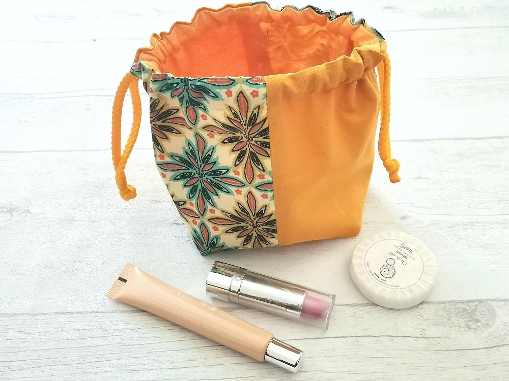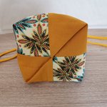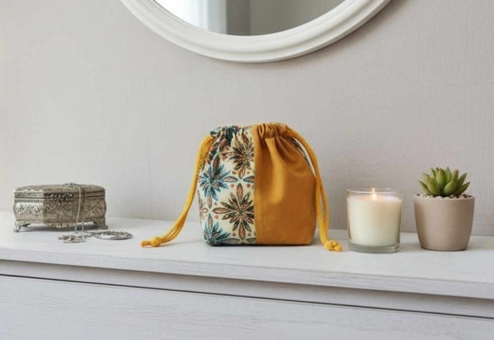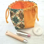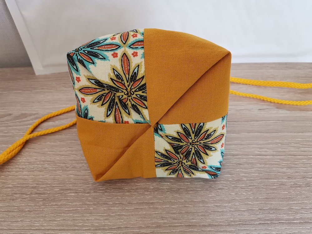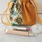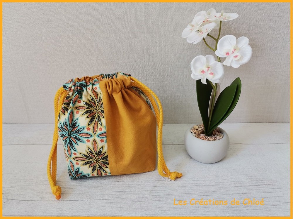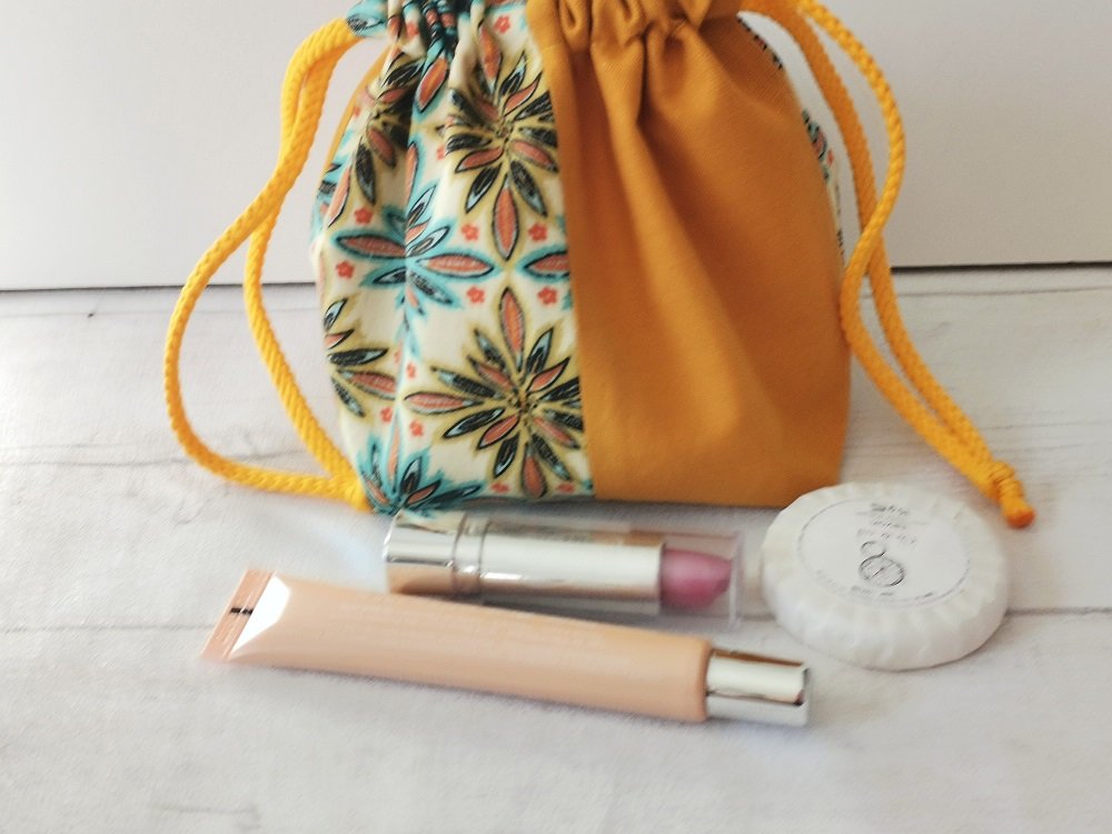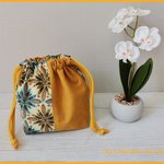 Pochon en coton imprimé et uni certifié Oeko-Tex avec doublure polyester. Fermeture par un cordon coulissant de couleur jaune moutarde.