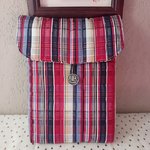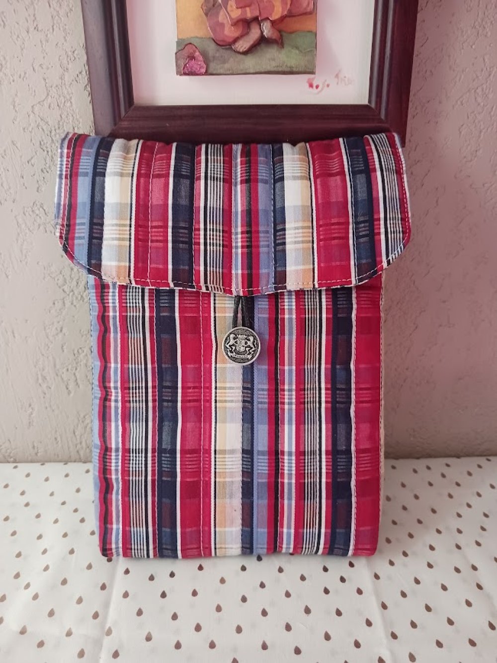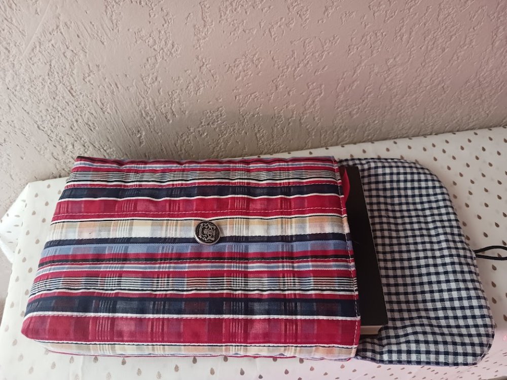 Protège livre a rabat " écossais" en coton fantaisie matelassé bande droite fait main et doublé en coton vichy marine et blanc 24.5 cm X19 cm FAIT MAIN