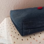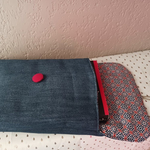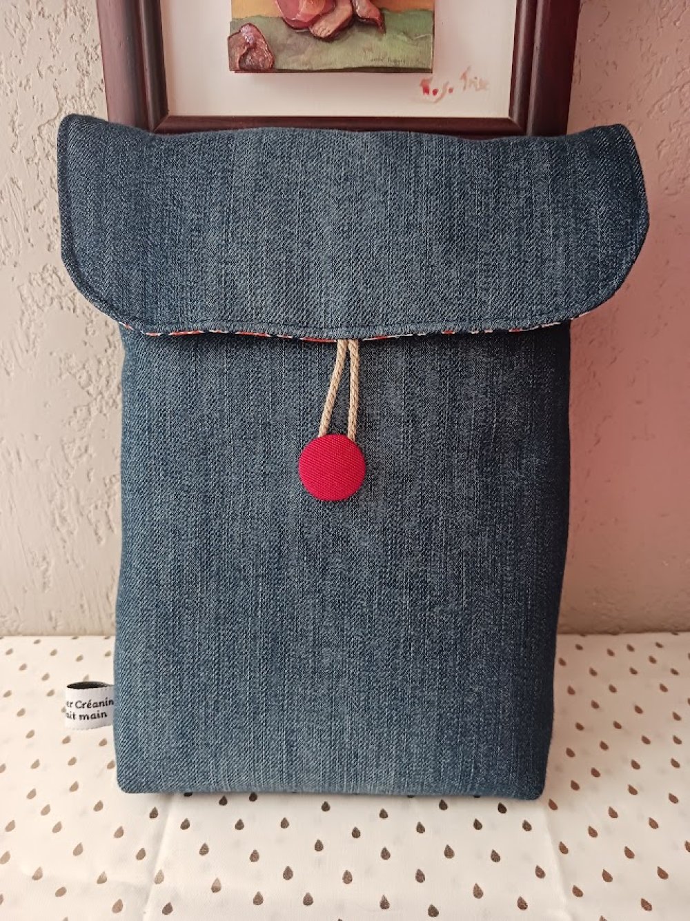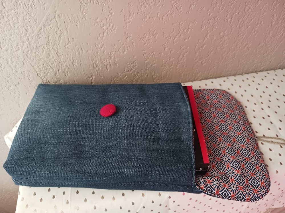 Protège livre a rabat " jeans recyclé " en coton et ouatine fait main et doublé en popeline de coton fantaisie marine et rouge 24.5 cm X19 cm FAIT MAIN