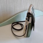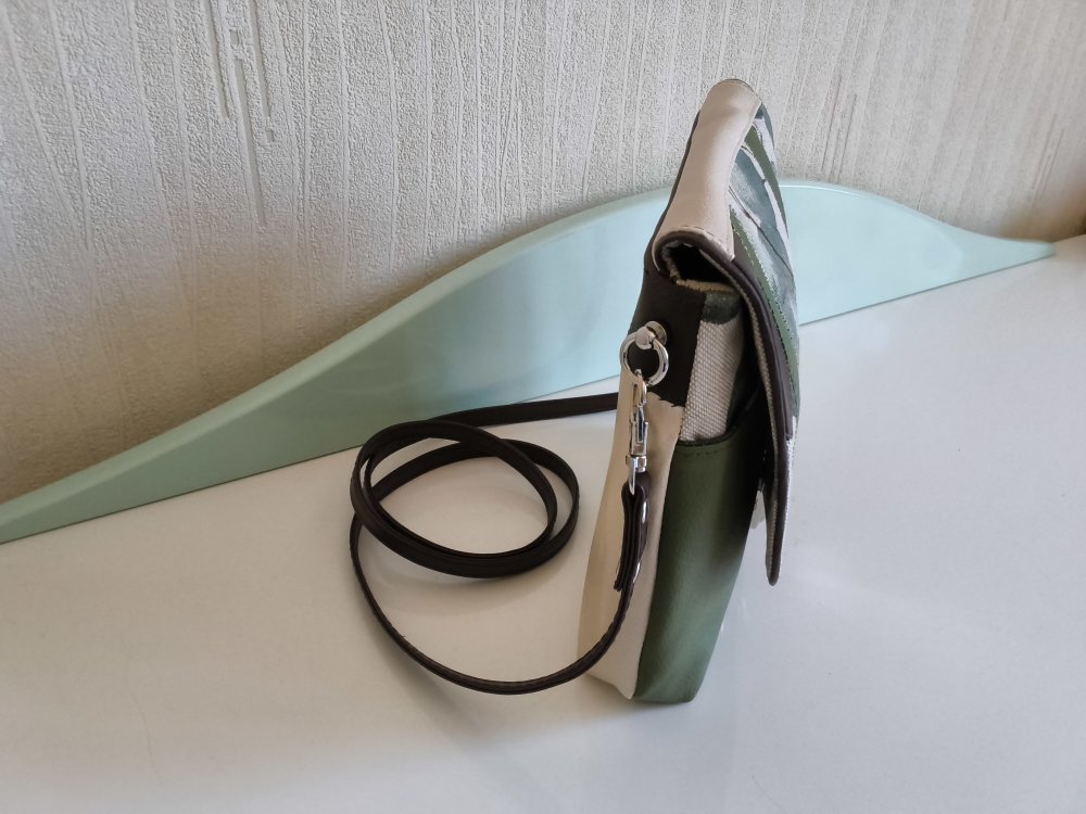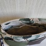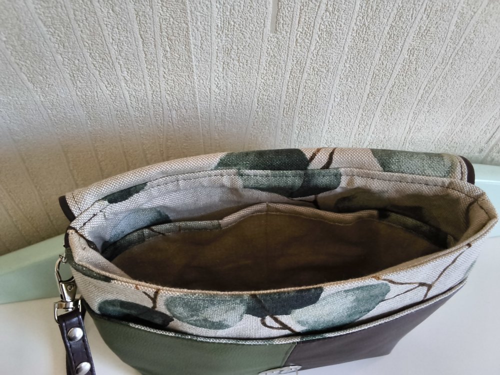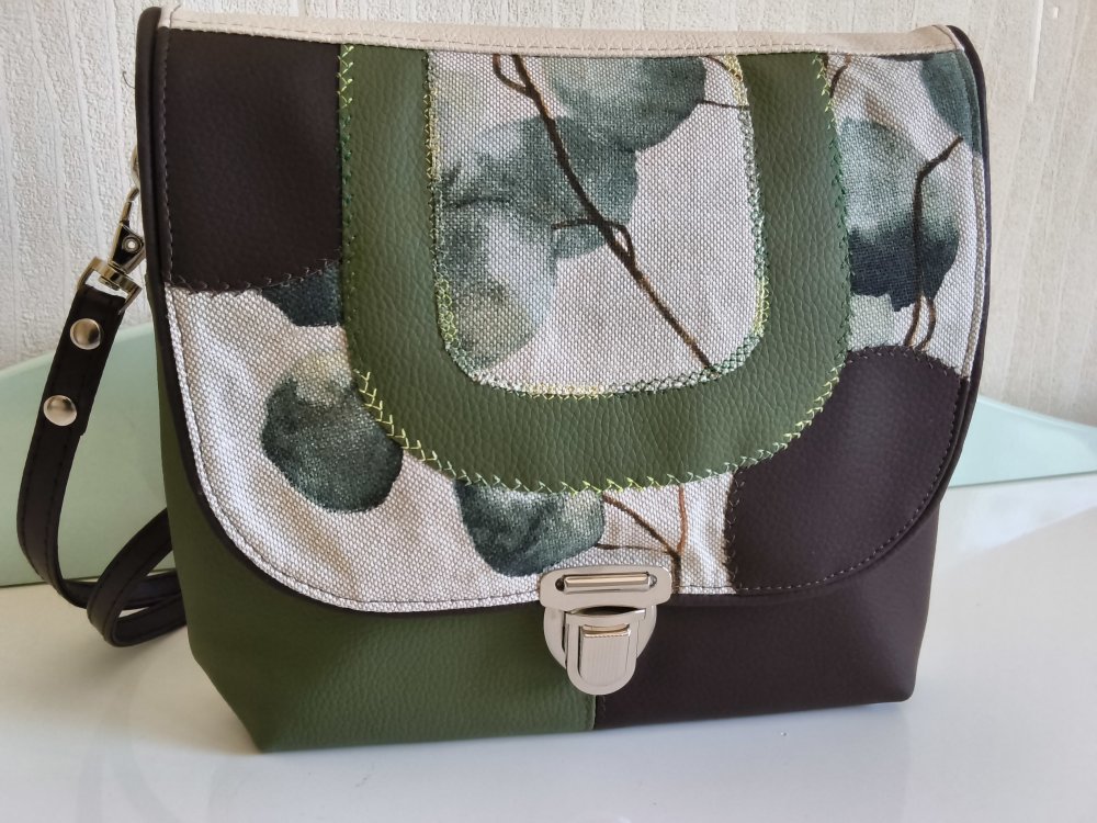 Sac en simili cuir vert, bru  et tissu beige avec impression feuilles. 1 poche devant et 2 poches intérieures.