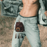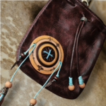Sacoche en cuir véritable brun, décoration en bois