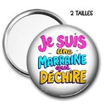 Miroir double face : 1 face miroir + 1 face décorée avec l'inscription "Miroir de poche je suis une marraine qui déchire"