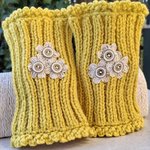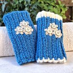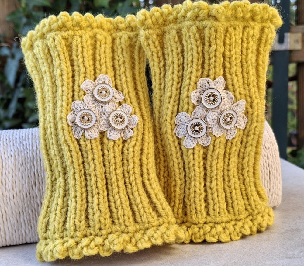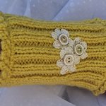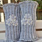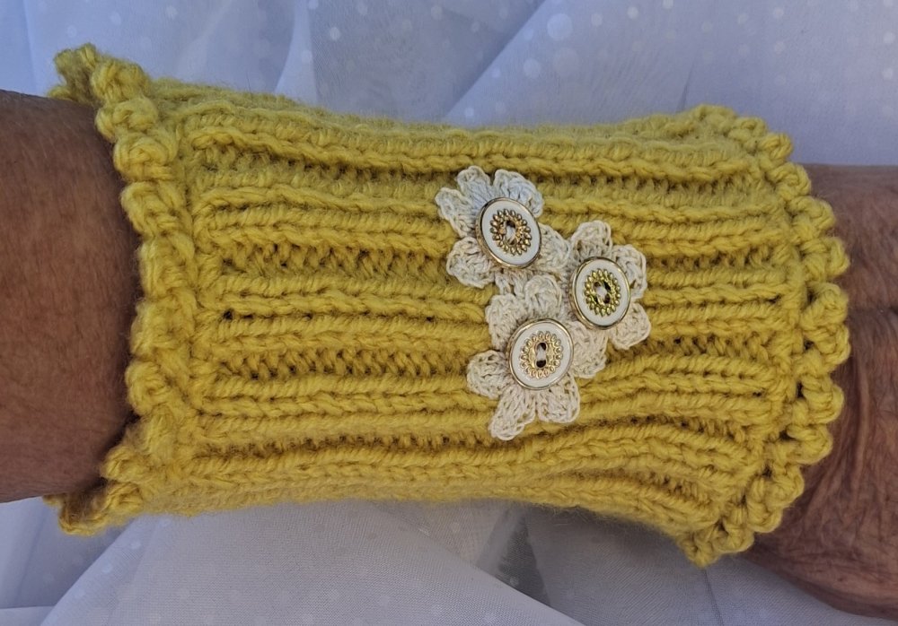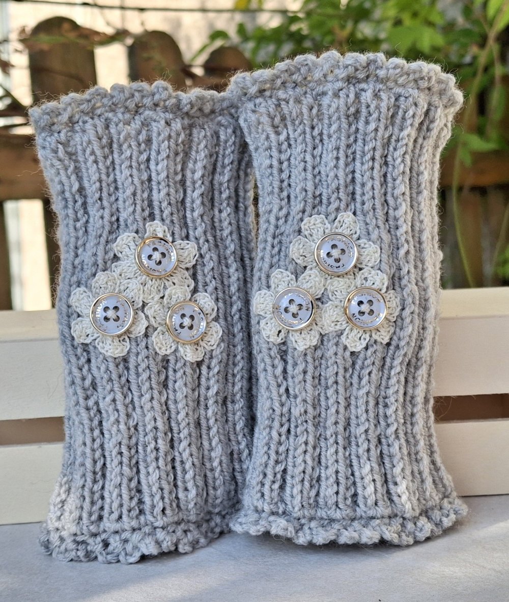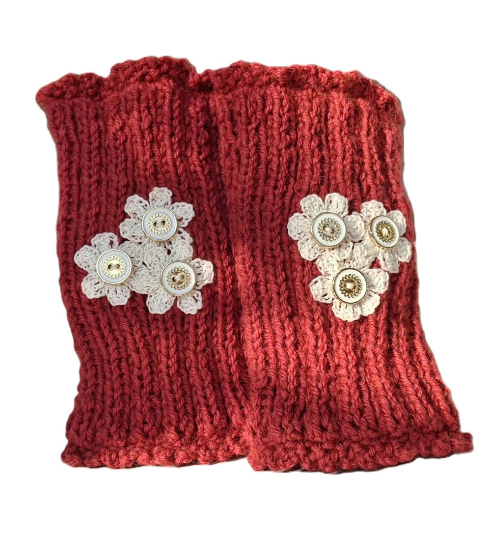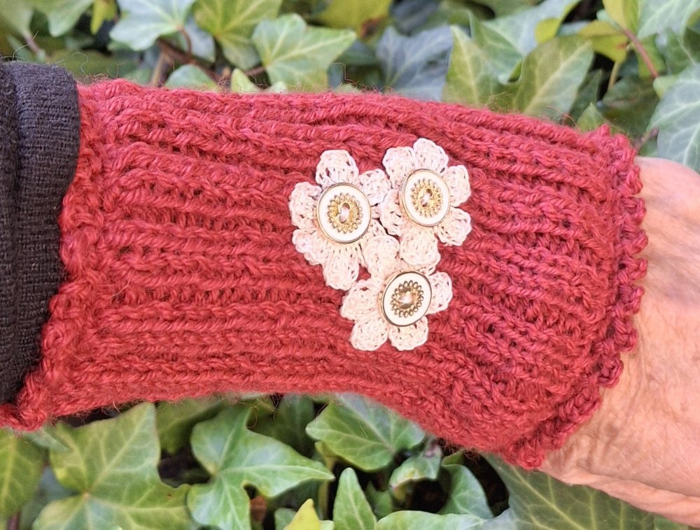 Chauffe poignets brodées de fleurs au crochet en fil de coton mercerisé DMC, avec des boutons fantaisie choisis avec grand soin pour une parfaite harmonie. Les bordures sont faites au crochet.