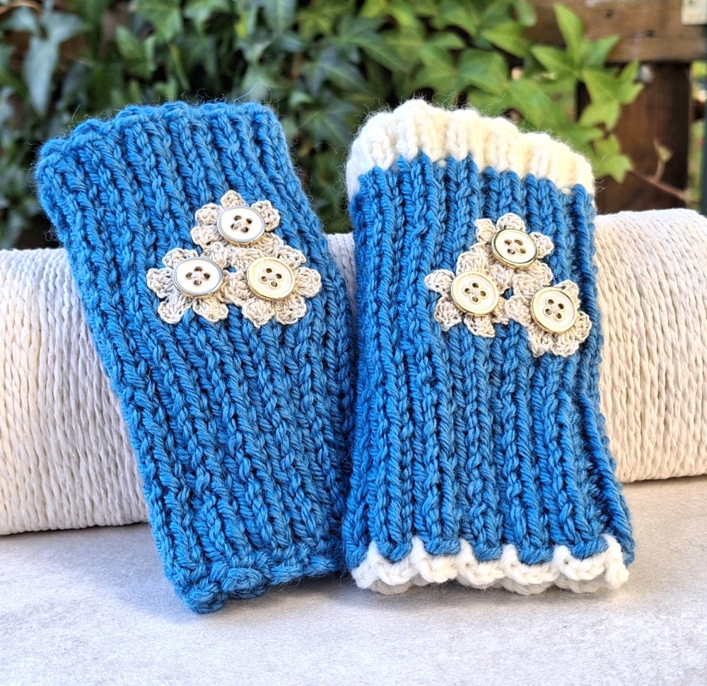 Chauffe mains tricotées main, chauffe poignets brodées, mitaines, laine fibres naturelles, jaune, rouge, gris, bleu