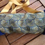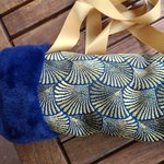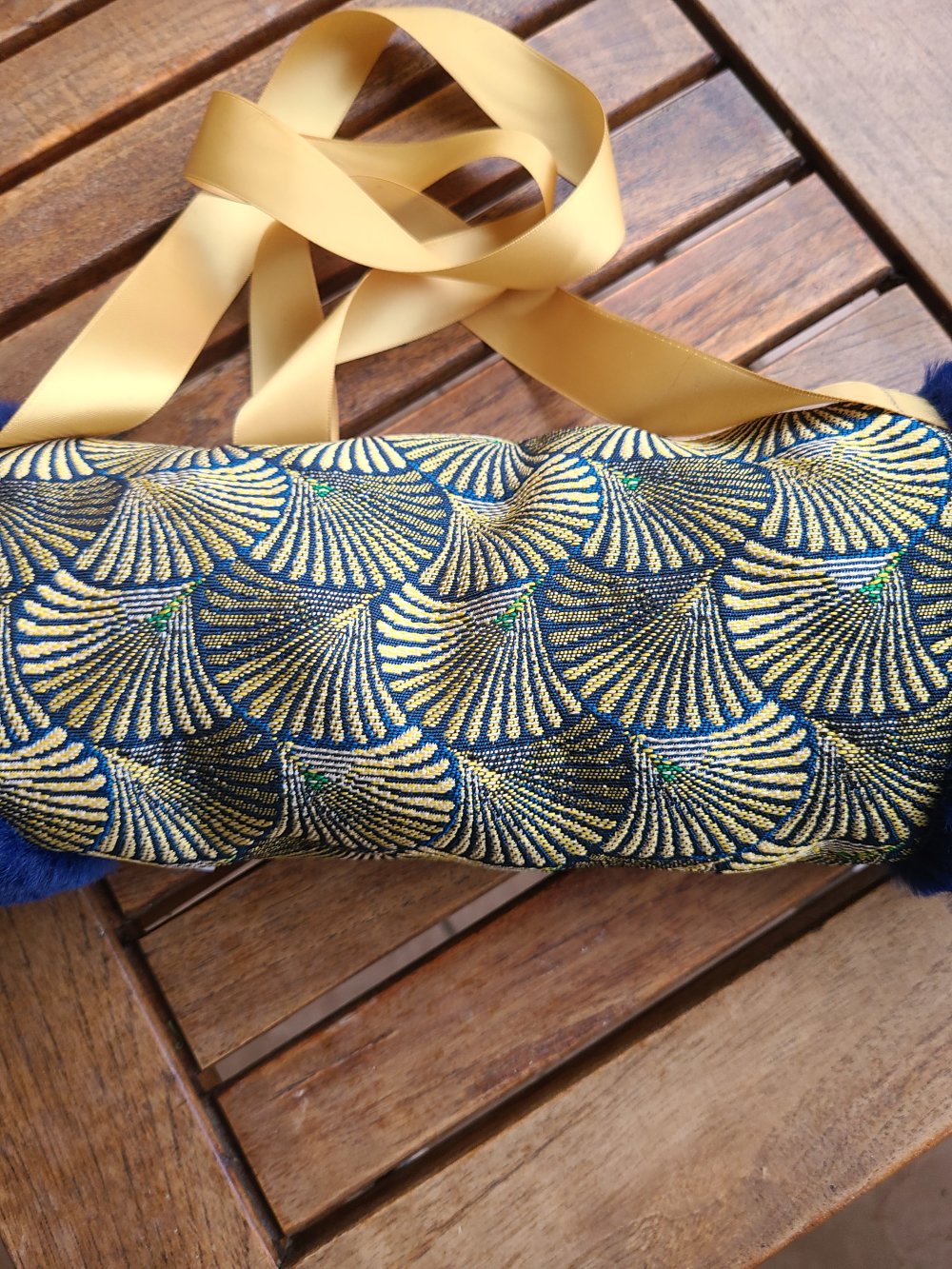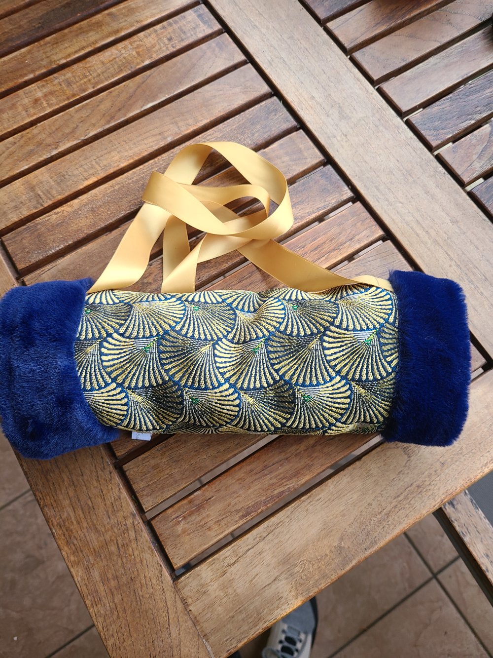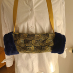 Un manchon multicolore doré bordé de fausse fourrure bleue pour mettre ses mains bien au chaud cet hiver.