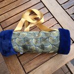 Un joli cordon ruban satiné dore se met autour du cou. Il est doublé d'une belle polaire bleu très chaude et confortable Ses dimensions sont de 30 cm sur 15 cm.