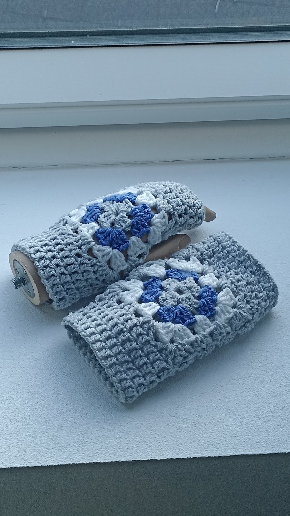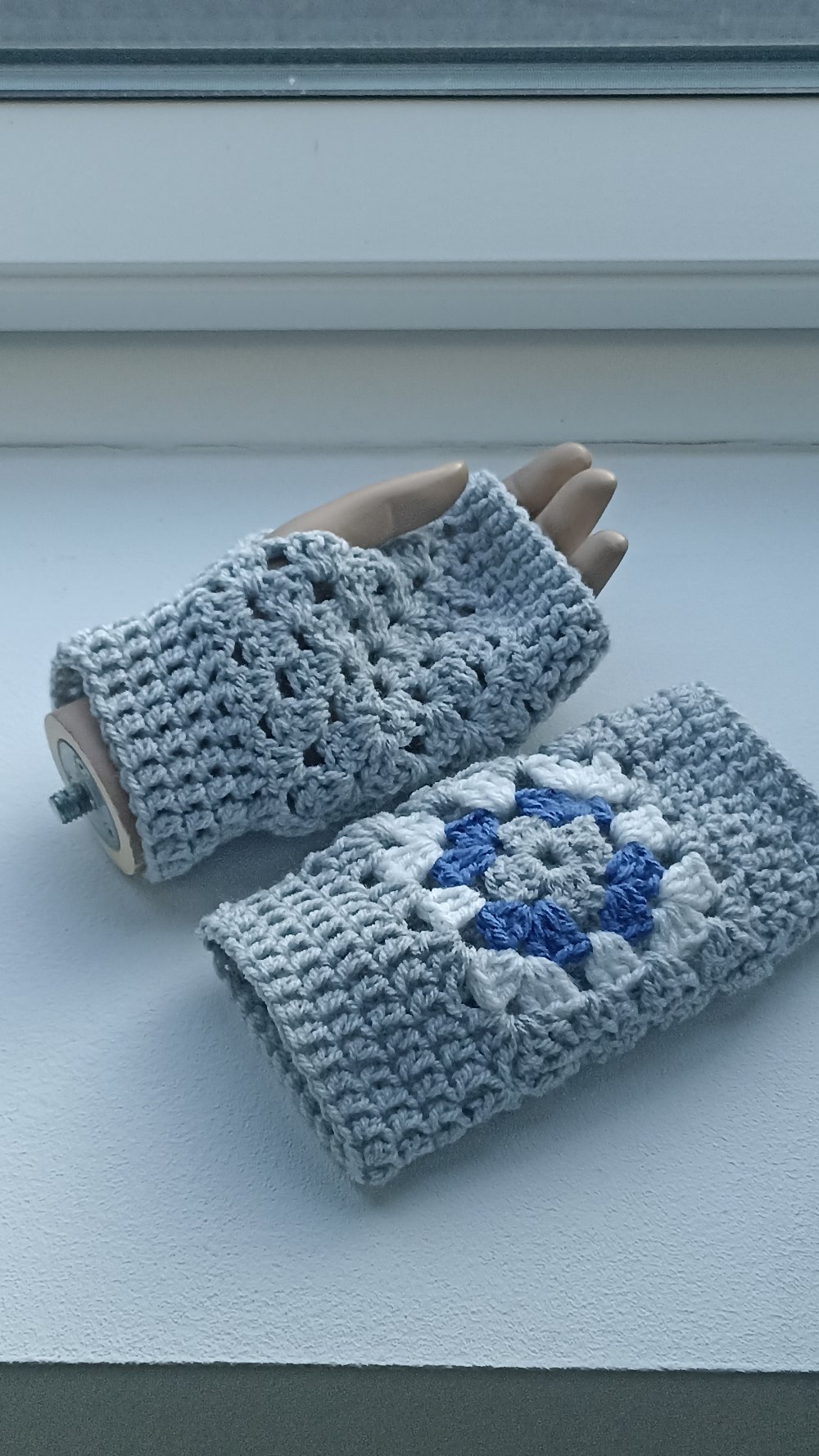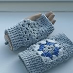Mitaines sans doigts au crochet Granny gris, bleu, blanc,