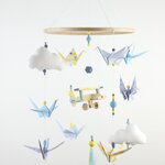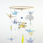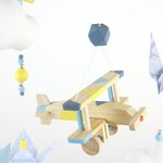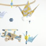 Mobile bébé origami avion bois bleu ciel, jaune et blanc