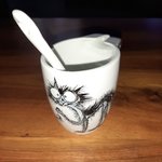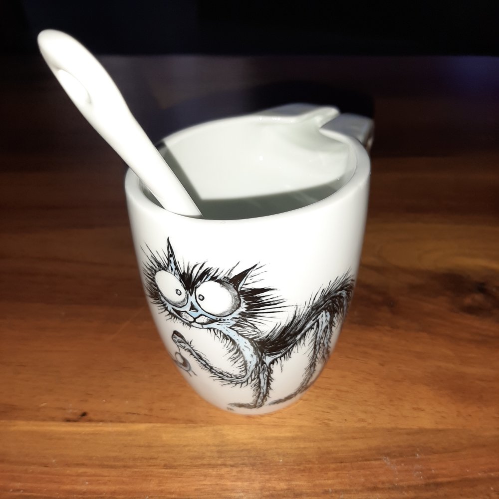 mug en porcelaine peinte à la mai, au pinceau et à la plume avec cuiller motif chat ébouriffé