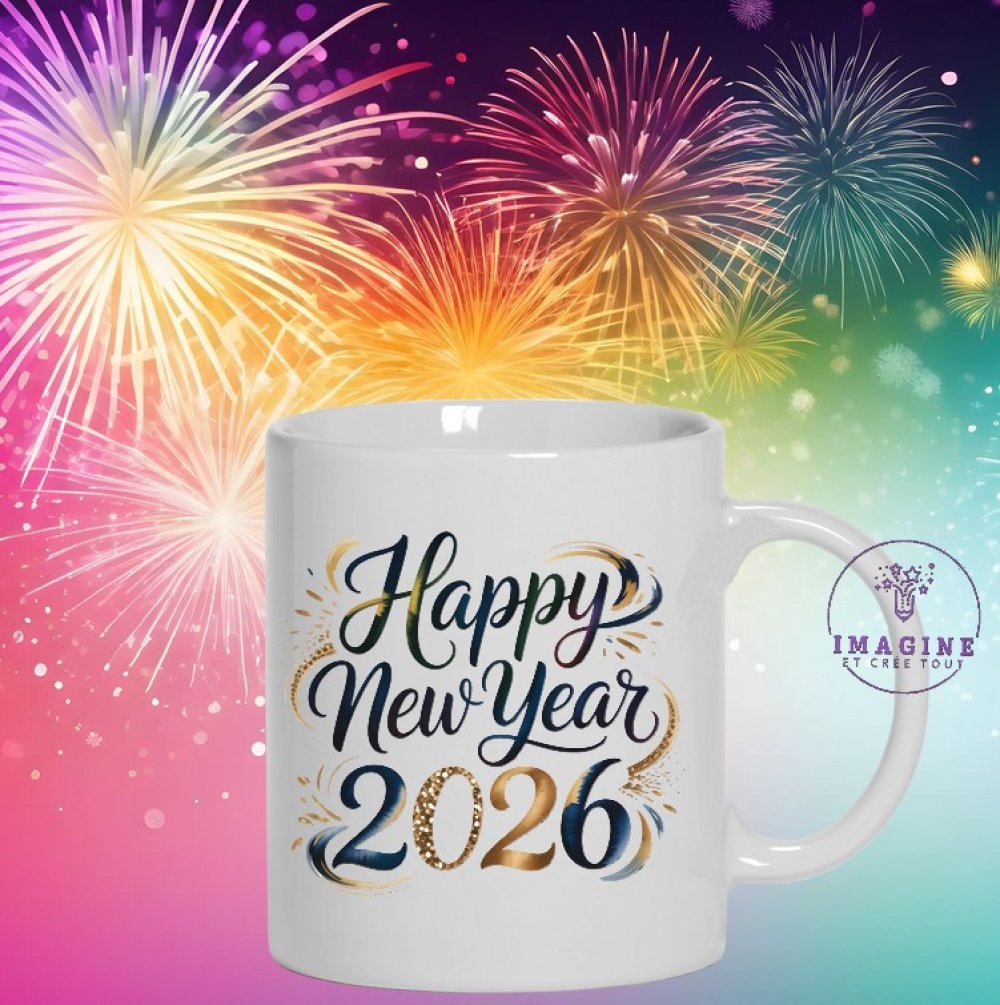 Mug - tasse - sublimation - impression infusible ink - happy - 2026 - feux artifices - célébration - colorful - multicolores