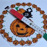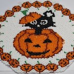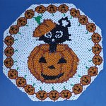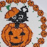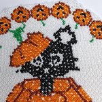 Motif d’Halloween : grande citrouille souriante, chat noir et frise de petites citrouilles.