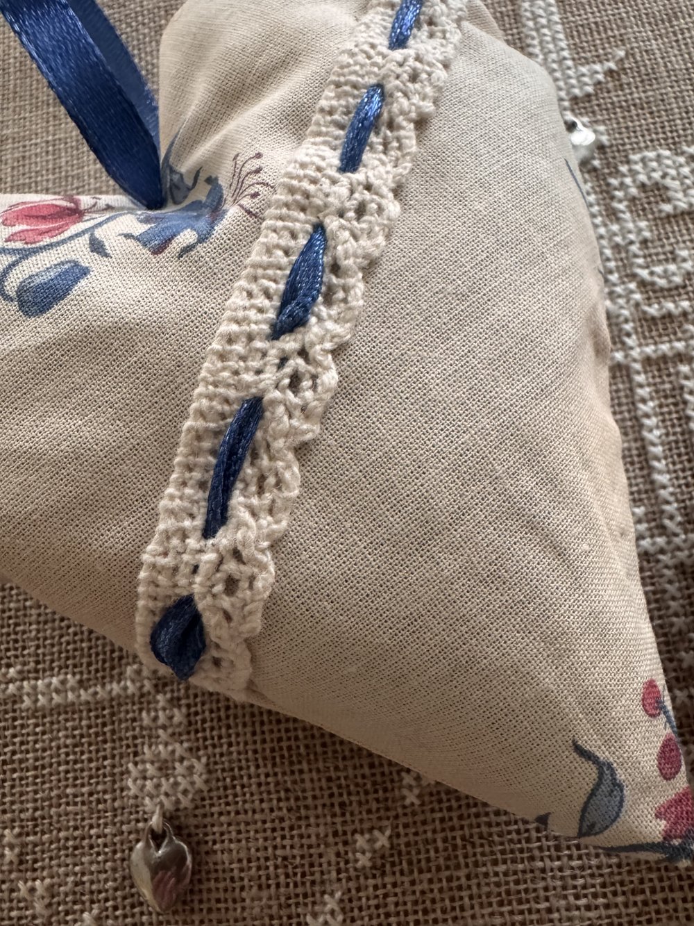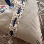 Application d’une dentelle coton ivoire entrelacée de satin bleu