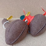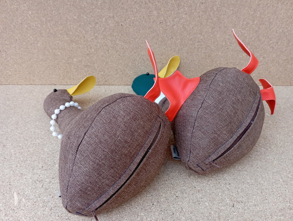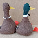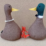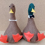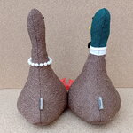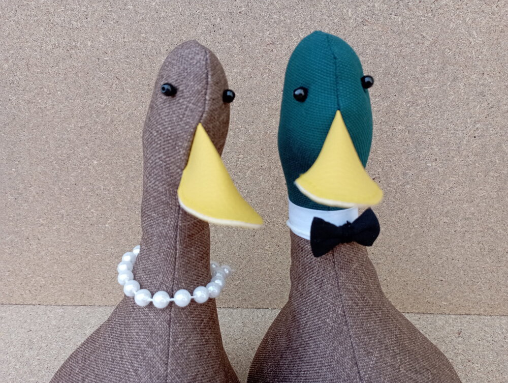 *** Les canards : Ces canards sont vendus avec noeud papillion et collier de perles. Ils sont fabriqués en tissu marron et le monsieur, son tête en vert canard avec son collier blanc.