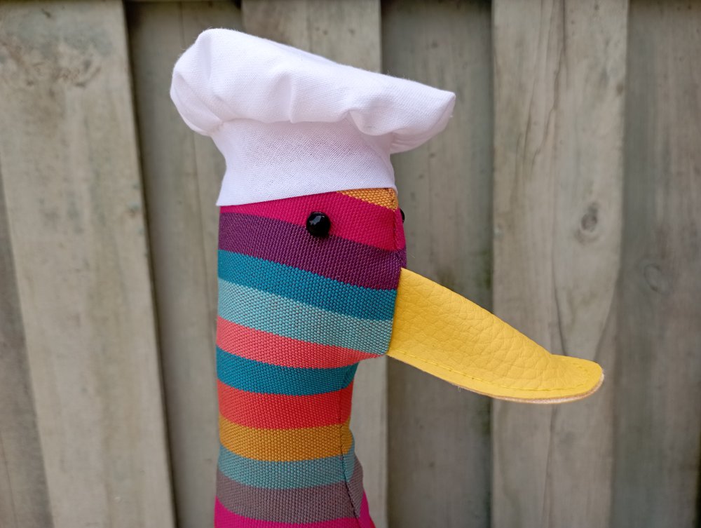 Il possède un bec en similicuir jaune, des yeux en perles noires et des pattes en similicuir orange avec des fils métalliques internes pour que vous puissiez le positionner comme vous le souhaitez !