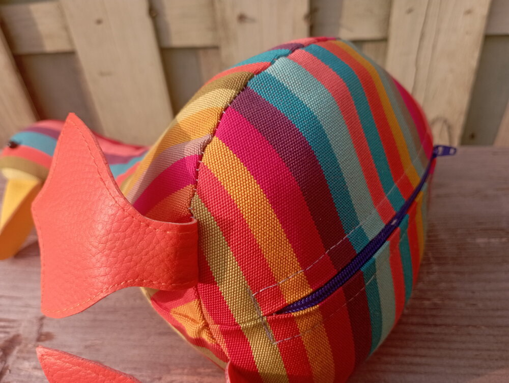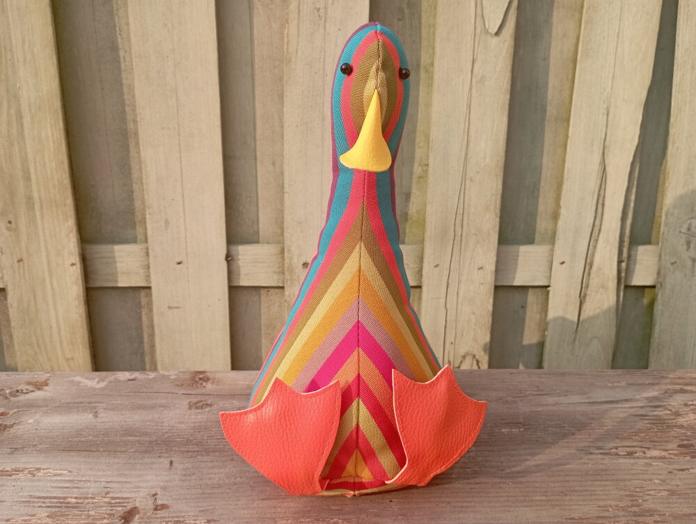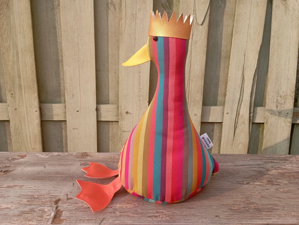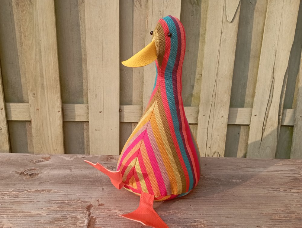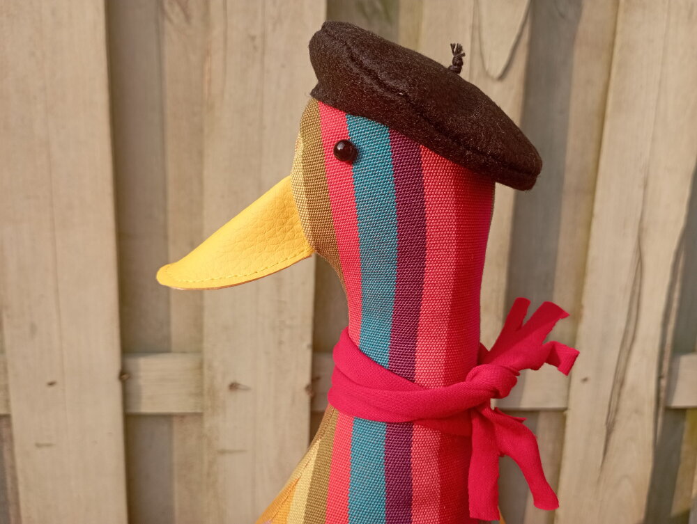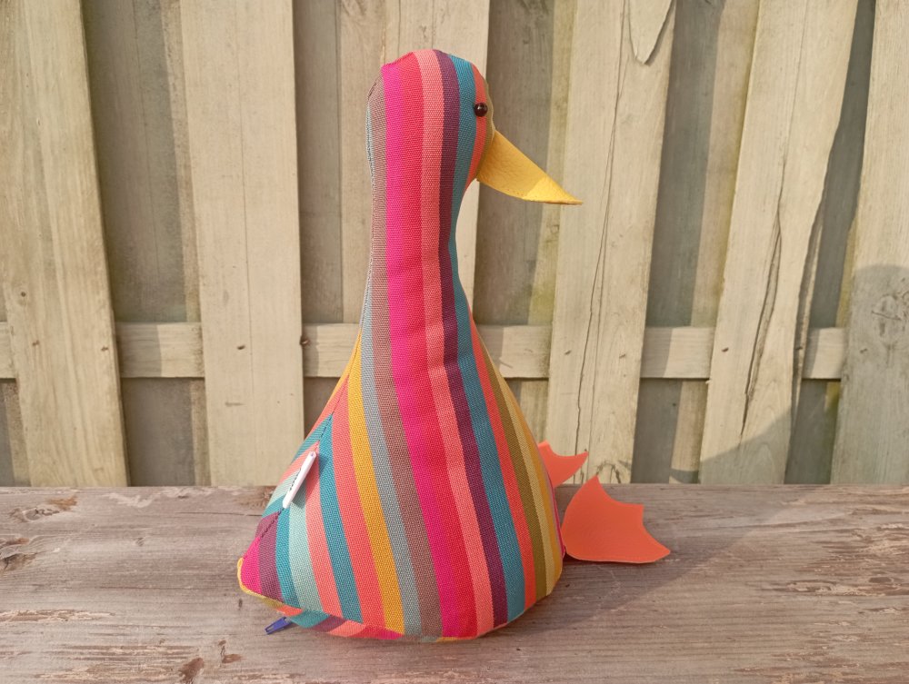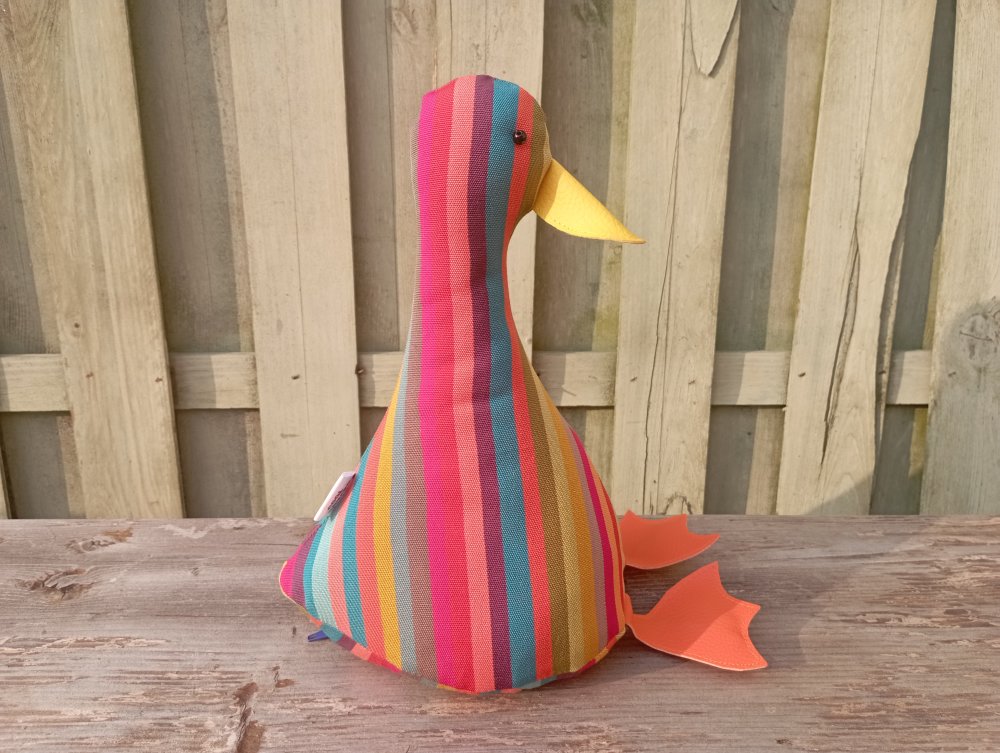*** Le canard : Ce canard est vendu SANS ACCESSOIRES. Il est fabriqué en tissu exterieur en coton avec des rayures verticals multicolore.