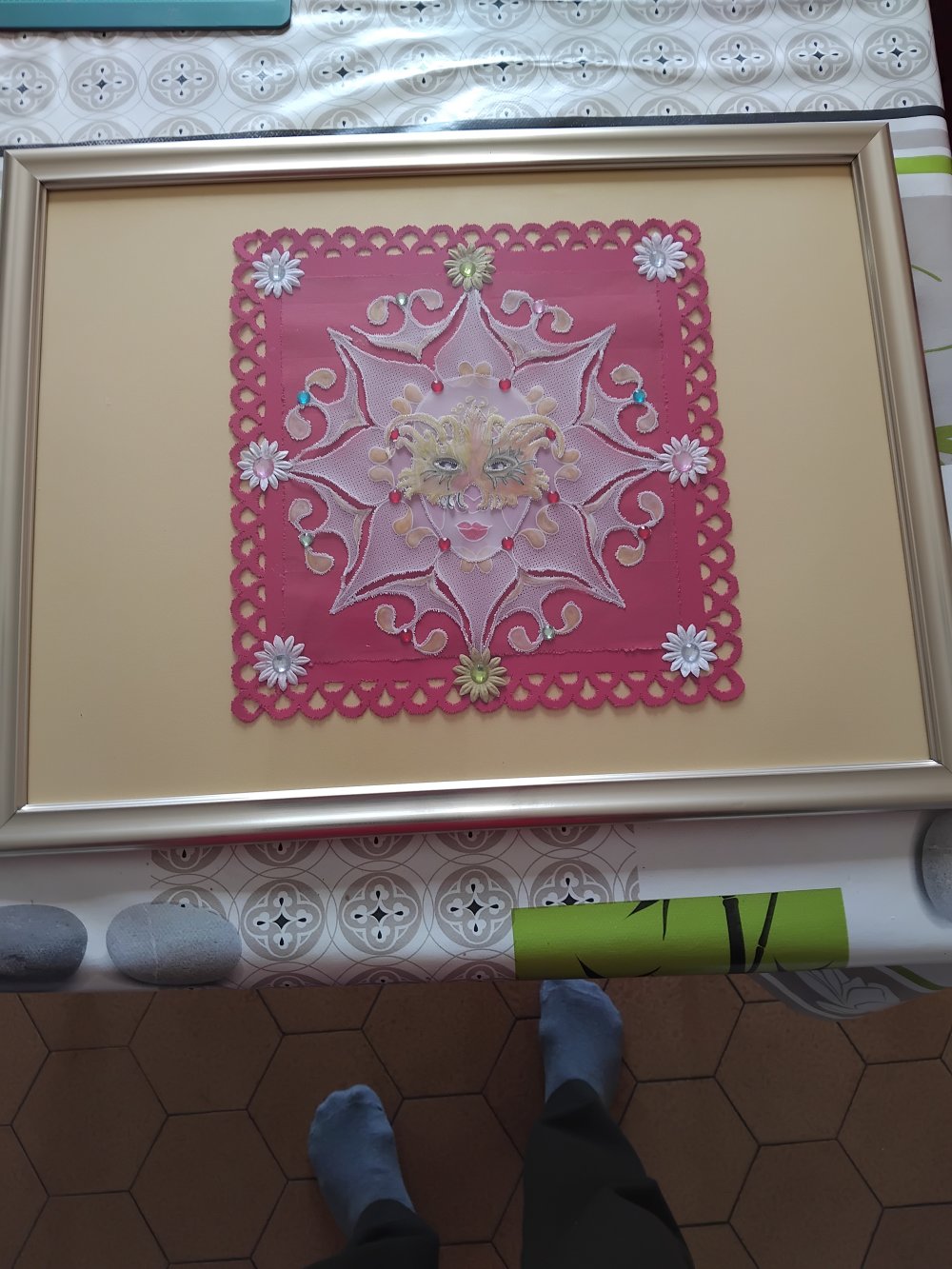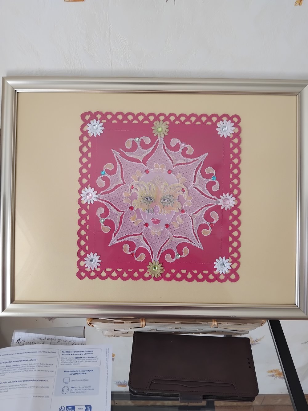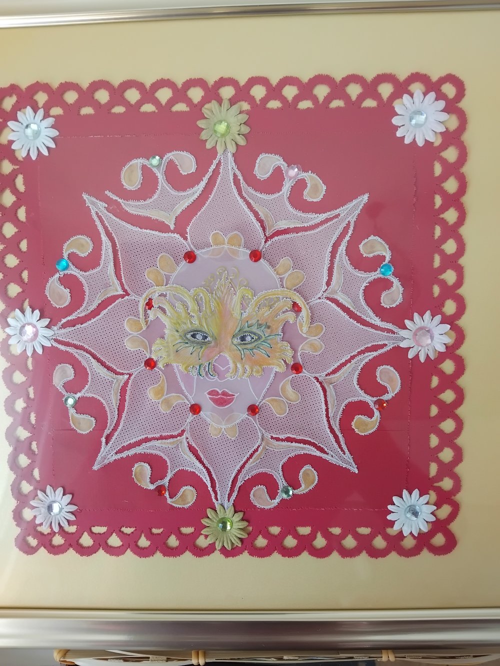tableau en dentelle sur papier représentant un masque en 2D
