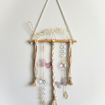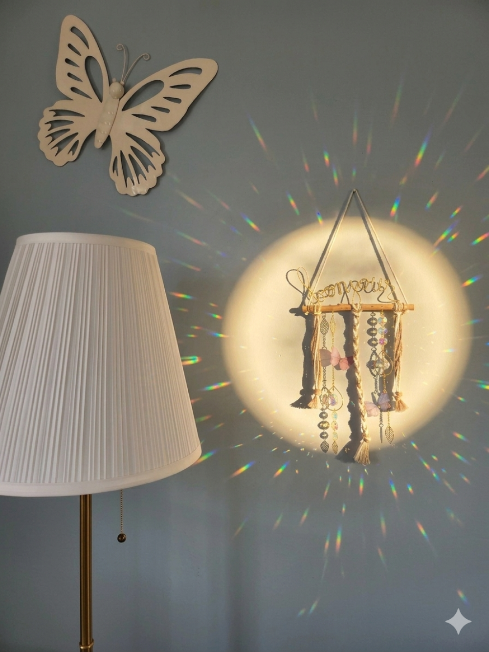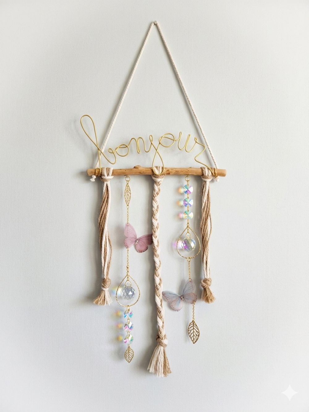 alliant douceur du macramé, papillons et éclat de cristaux.