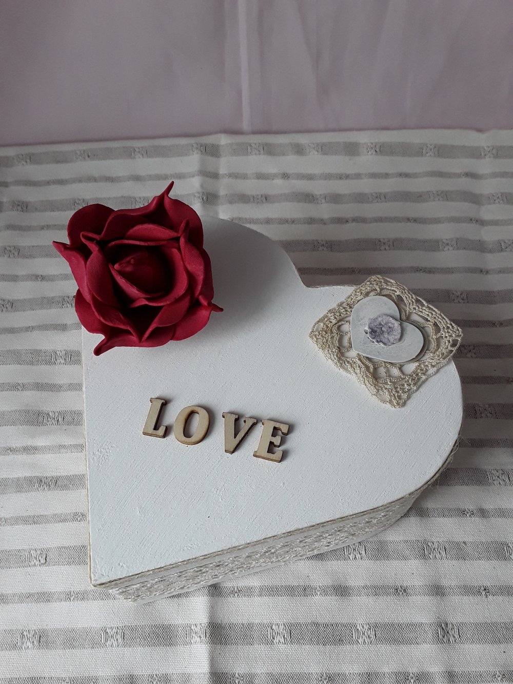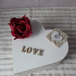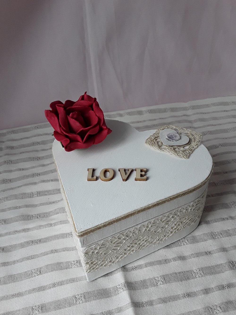 boite en bois coeur avec couvercle, peinte en blanc craie une dentelle ancienne , une rose en mousse, inscription LOVE en bois. Boite à bijoux, à secret ou objet de decoration .Style campagne chic, romantique