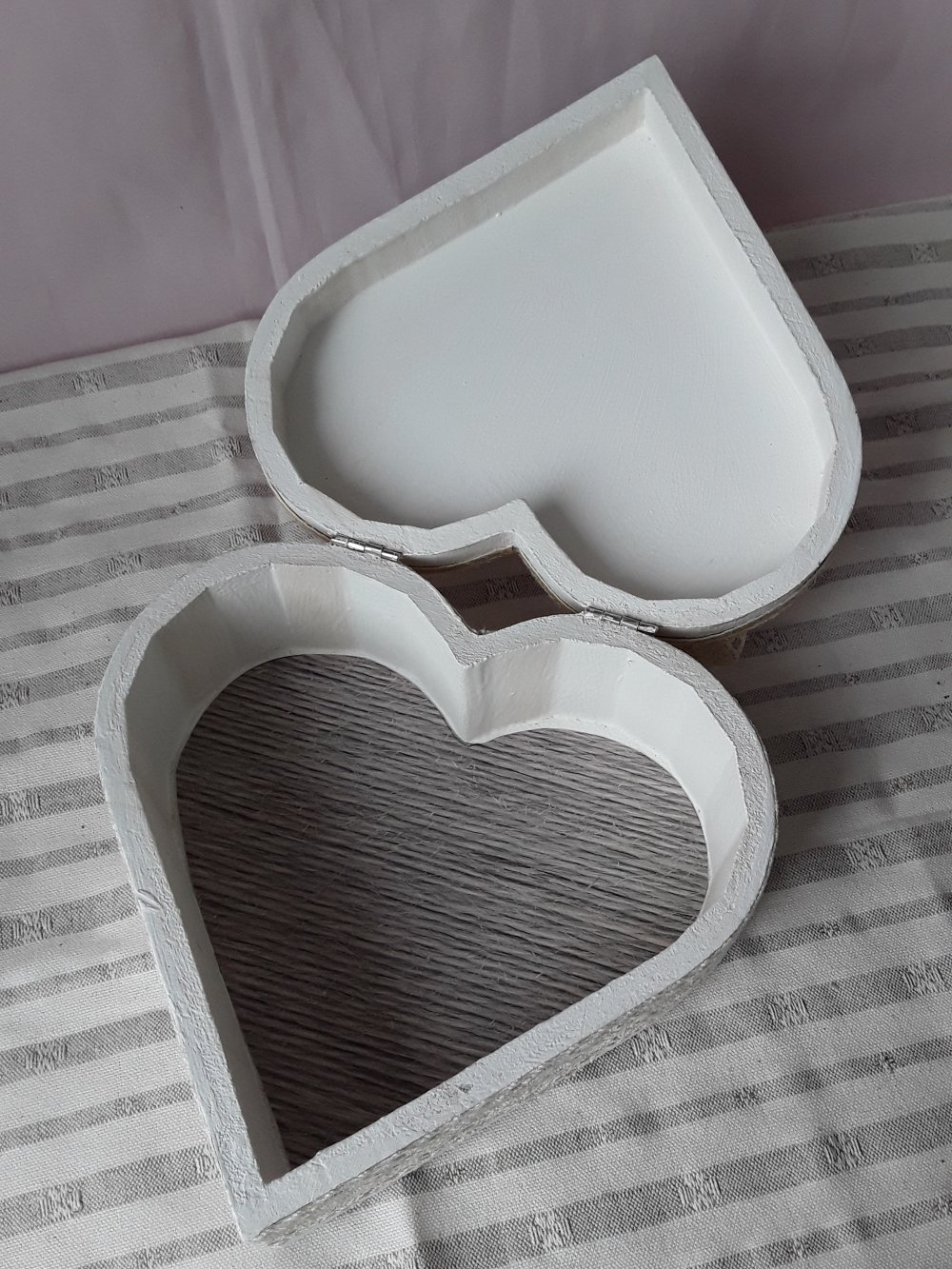 BOITE COEUR, A BIJOUX,A SECRET EN BOIS PEINT EN BLANC, DENTELLE ANCIENNE, ROSE EN TISSUE