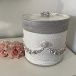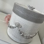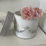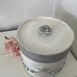 Je vous propose cette boîte en carton de couleurs taupe et blanc, décorée d'arabesques et d'une fleur.