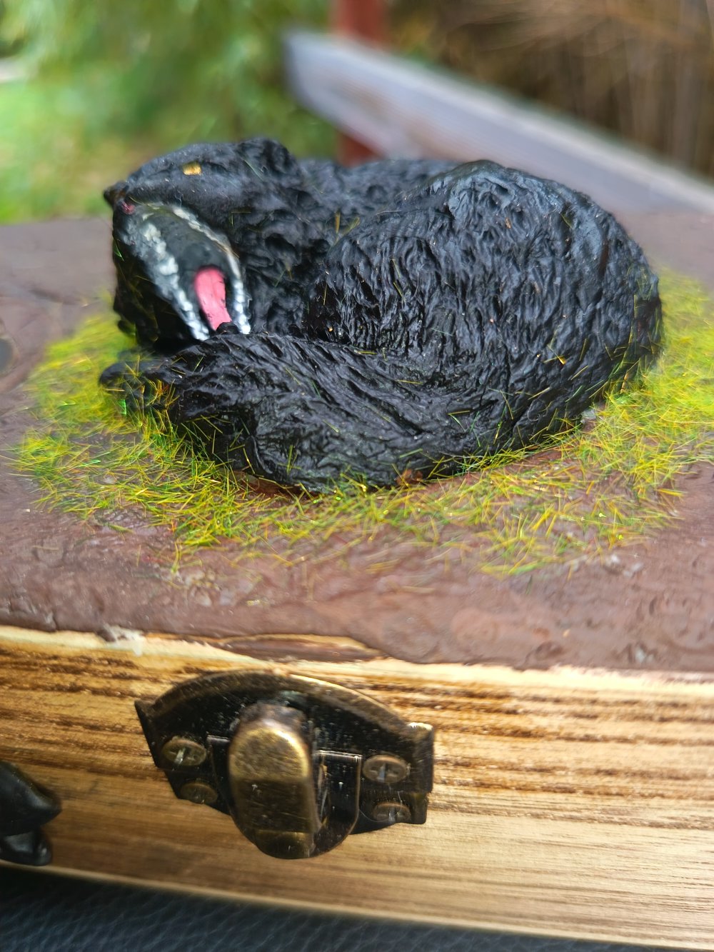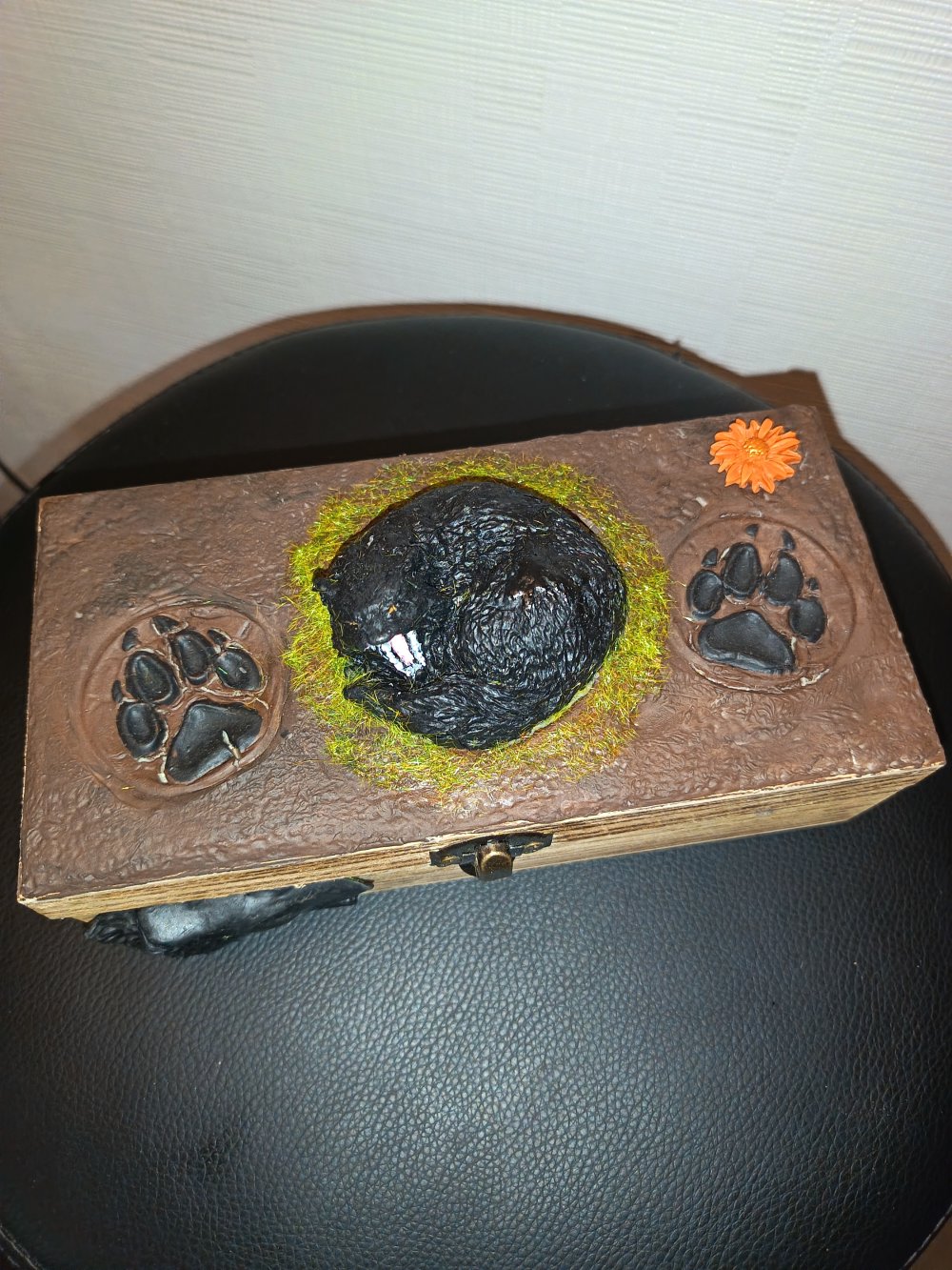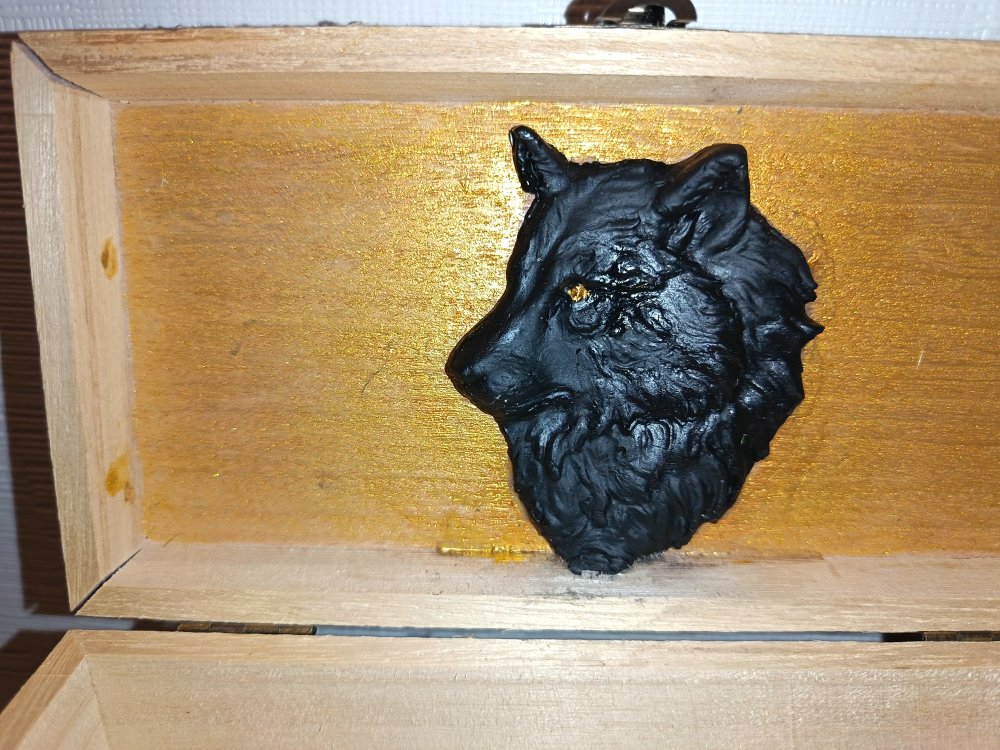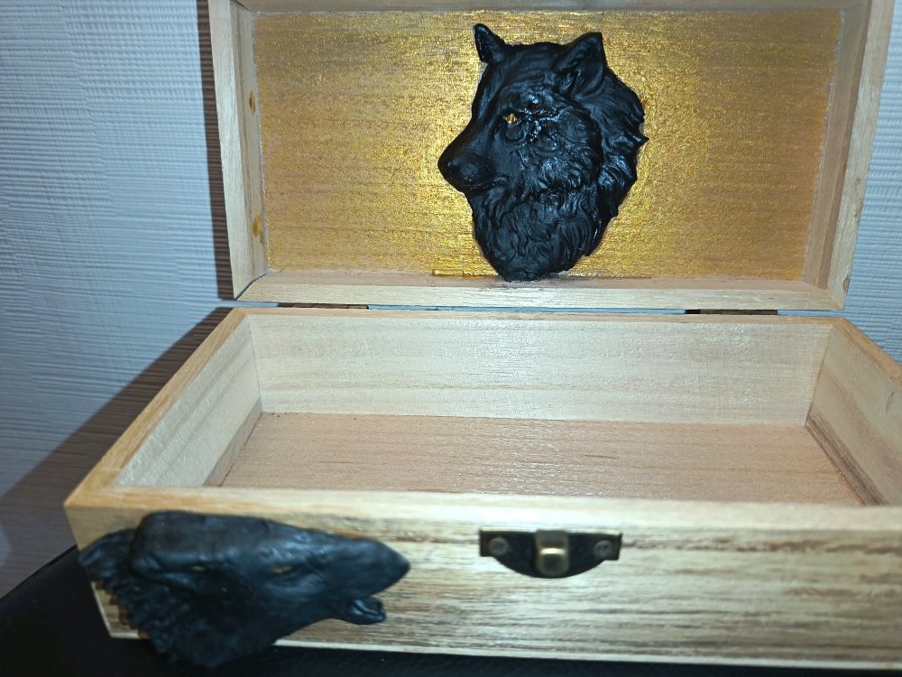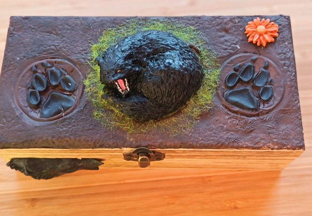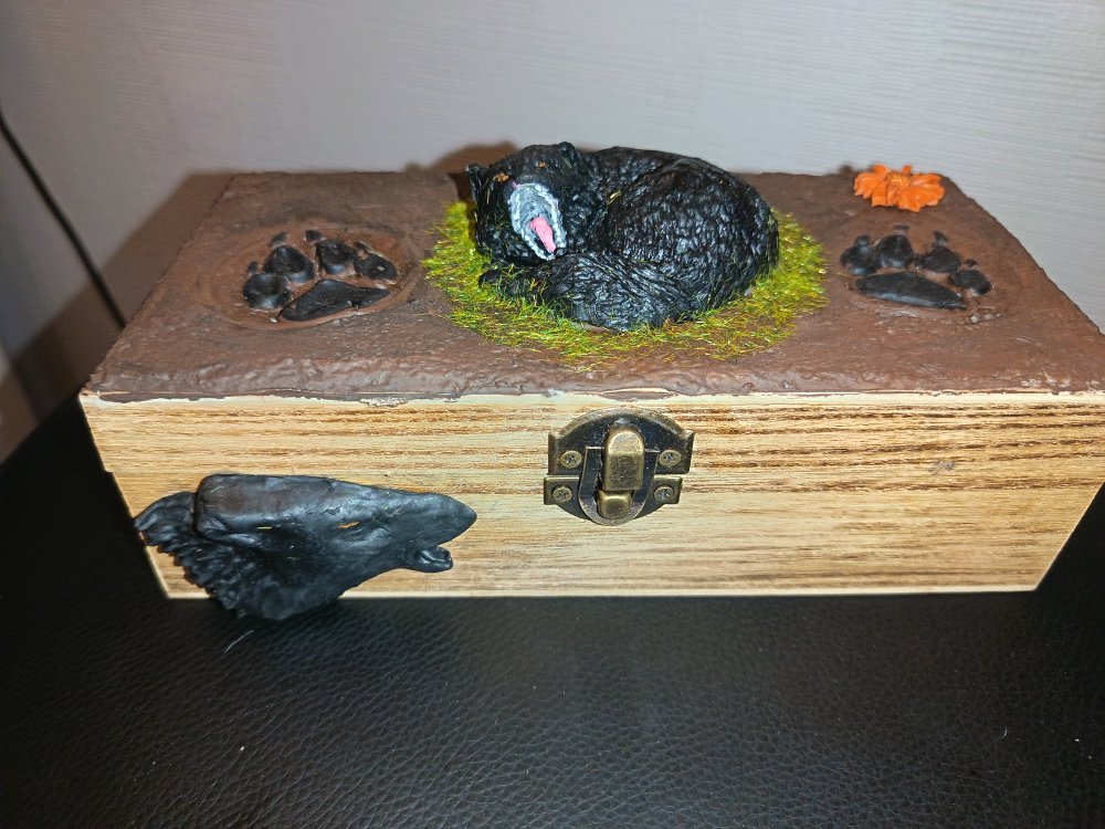 Boîte en bois décorée à la main, inspirée de la puissance du loup. Sculptures en porcelaine froide représentant un louveteau endormi, deux têtes de loup et des empreintes. Pièce unique mêlant nature, symbolisme et artisanat.