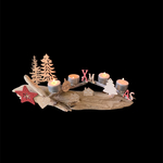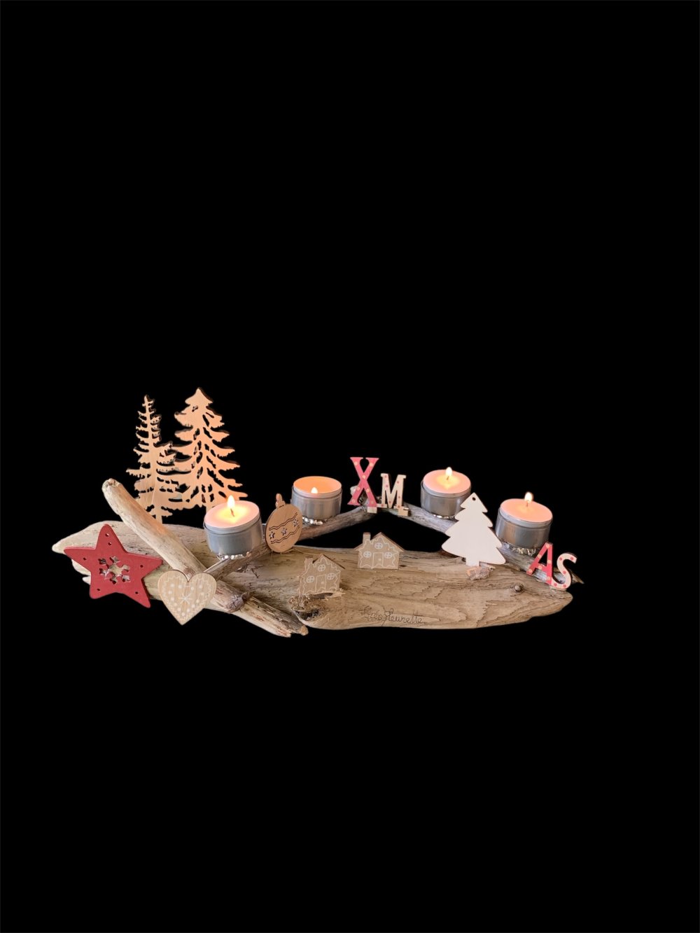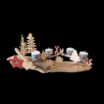 Centre de table en bois flotté et décorations, pour Noël. Décoration de Noël en bois flotté et 4 bougies. Chandelier pour table de Noël. Création Made in France, pour Noël. Bougeoir écolo pour Noël. Longueur 44 cm. Pièce unique en bois flotté. Noël écolo et original avec un bougeoir Made in France. Fabrication artisanale en bois flotté. Fait main dans le sud de la France.