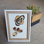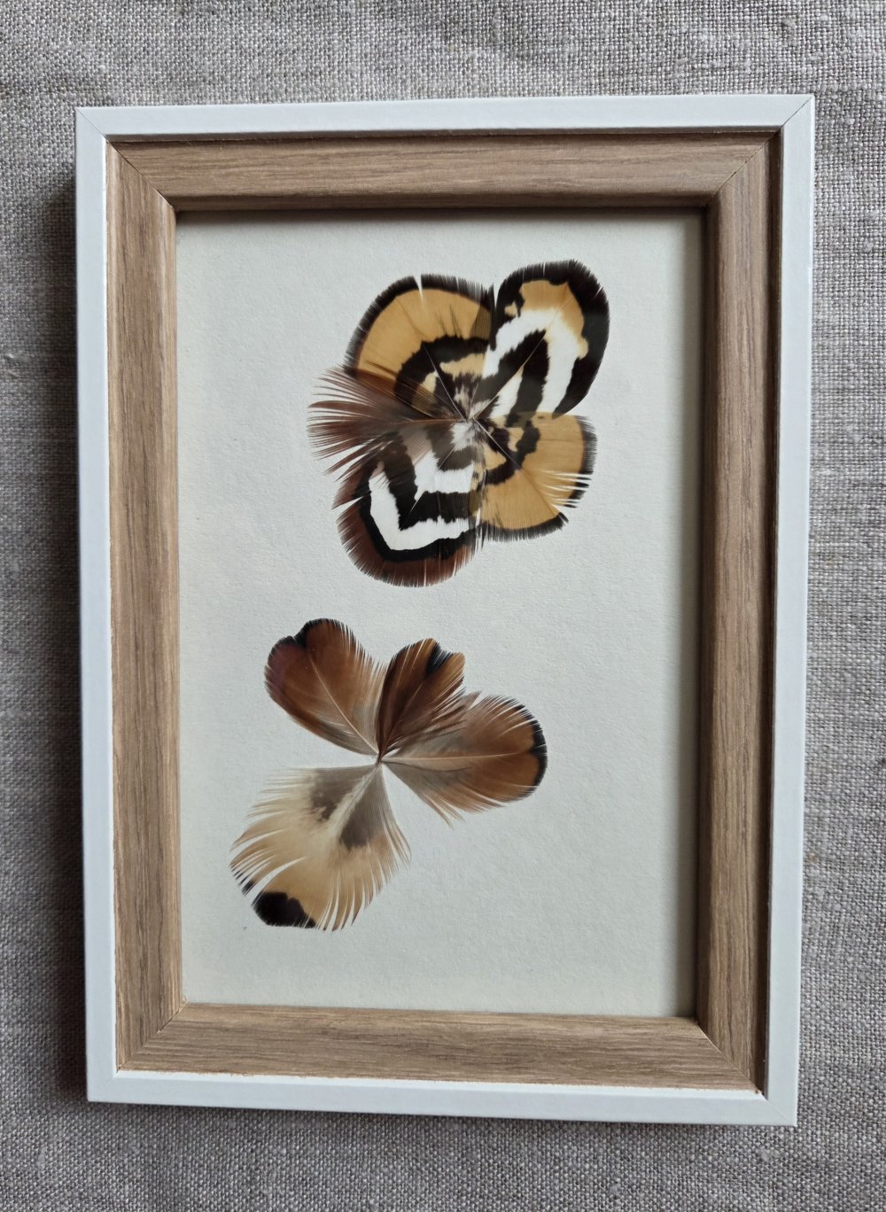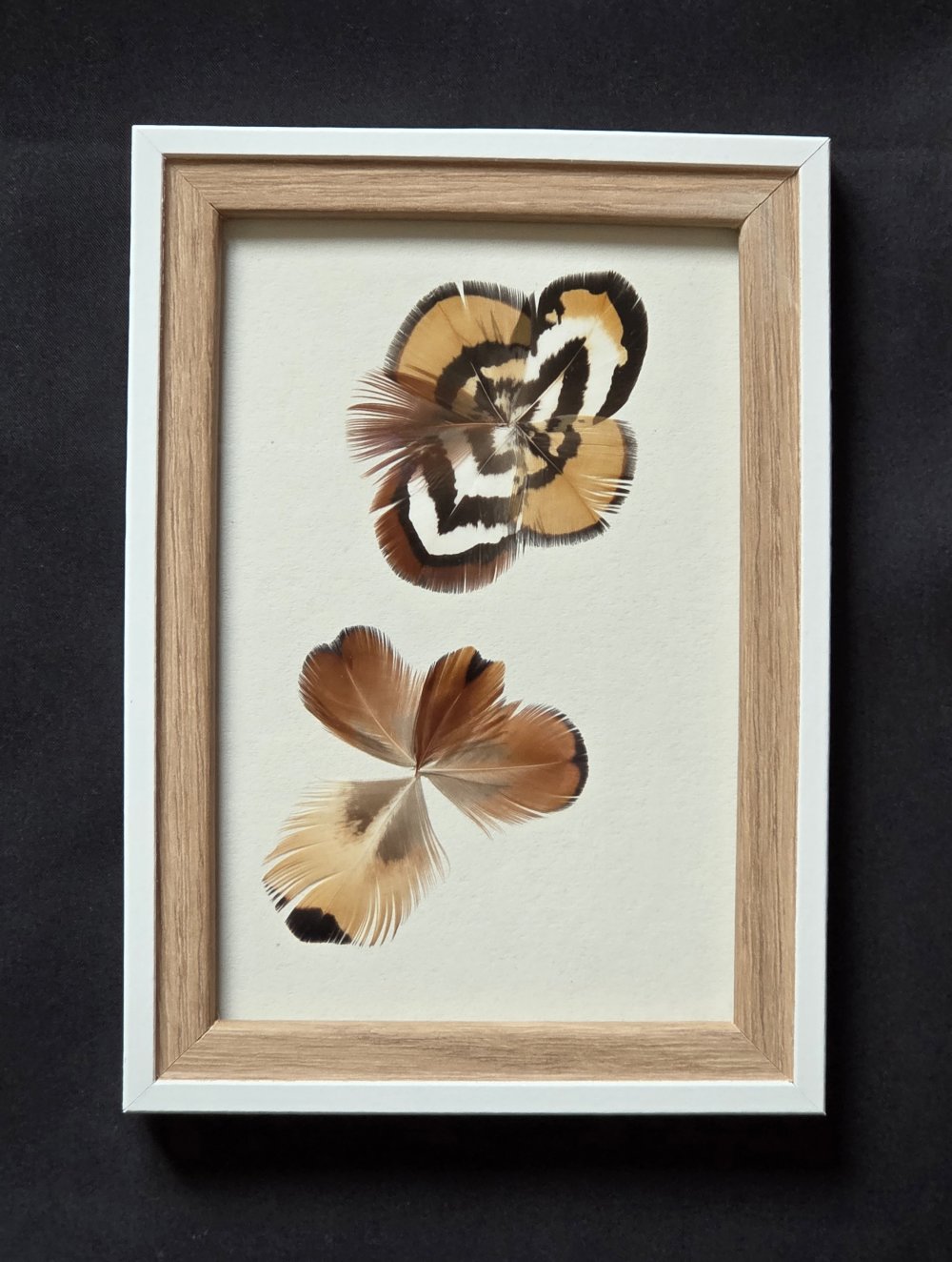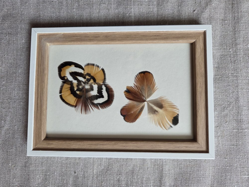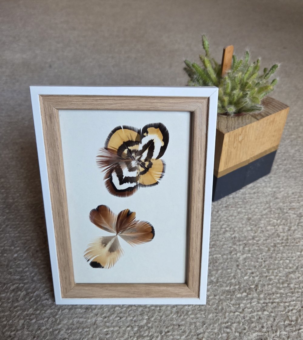 Récemment, j’ai eu envie de « mettre en scène » ces plumes d’oiseaux, sous forme de cadres décoratifs, en y intégrant parfois d’autres matériaux naturels. Parfois, je réalise moi-même l’encadrement. Chaque pièce est unique, créée au gré de mon imagination, de ma sensibilité et de mon inspiration du moment.
