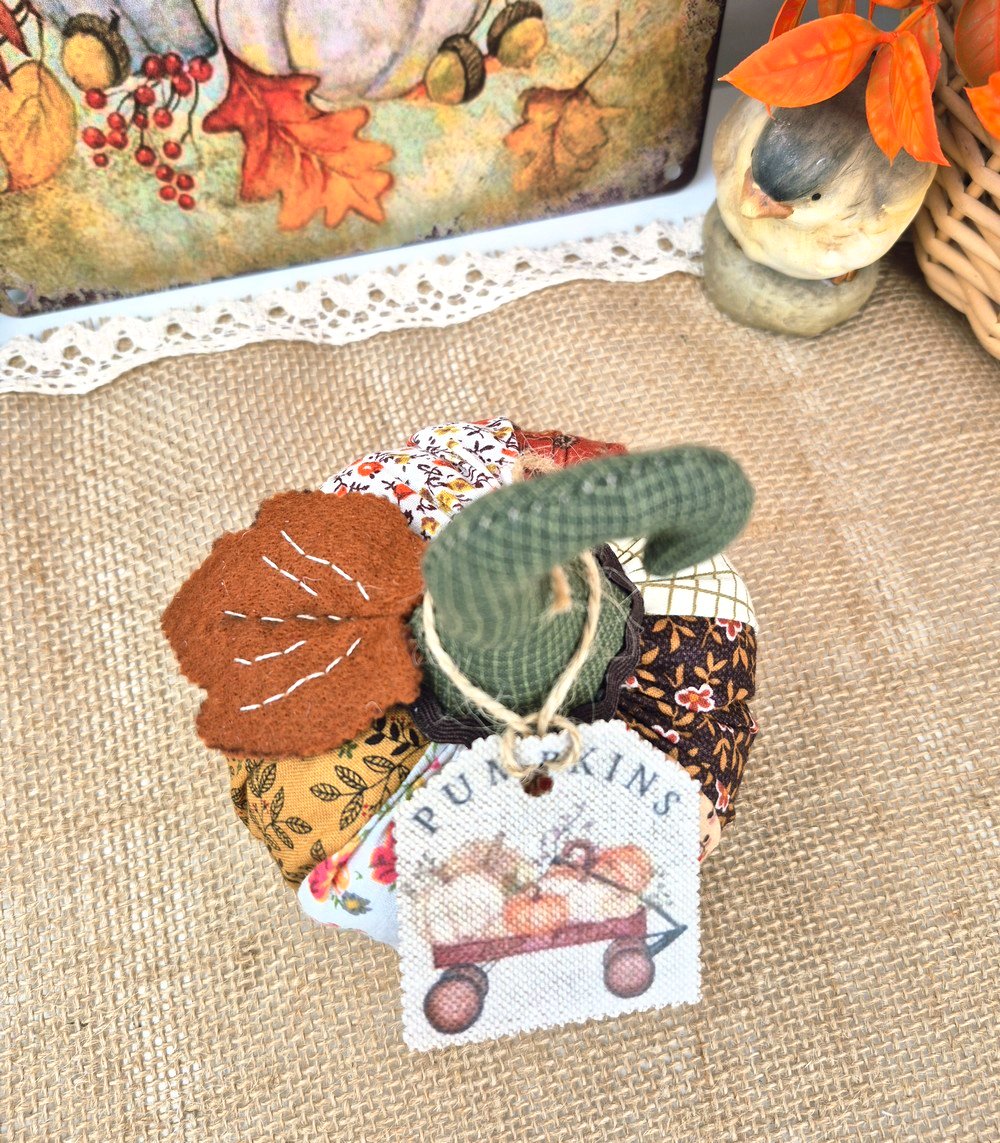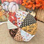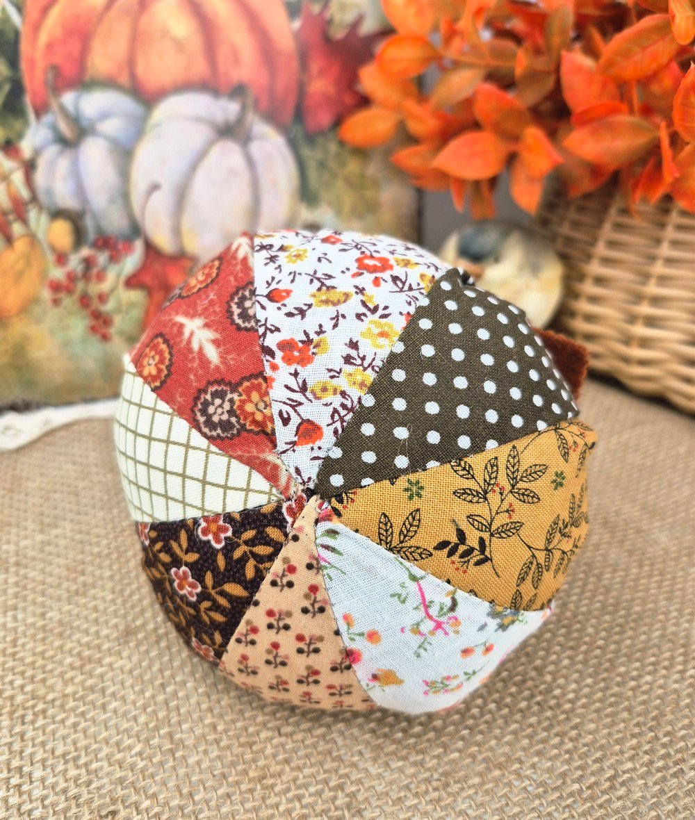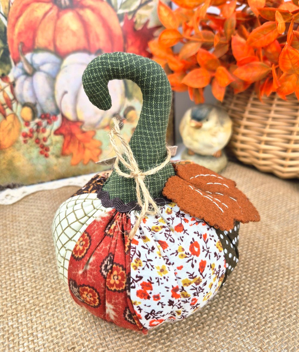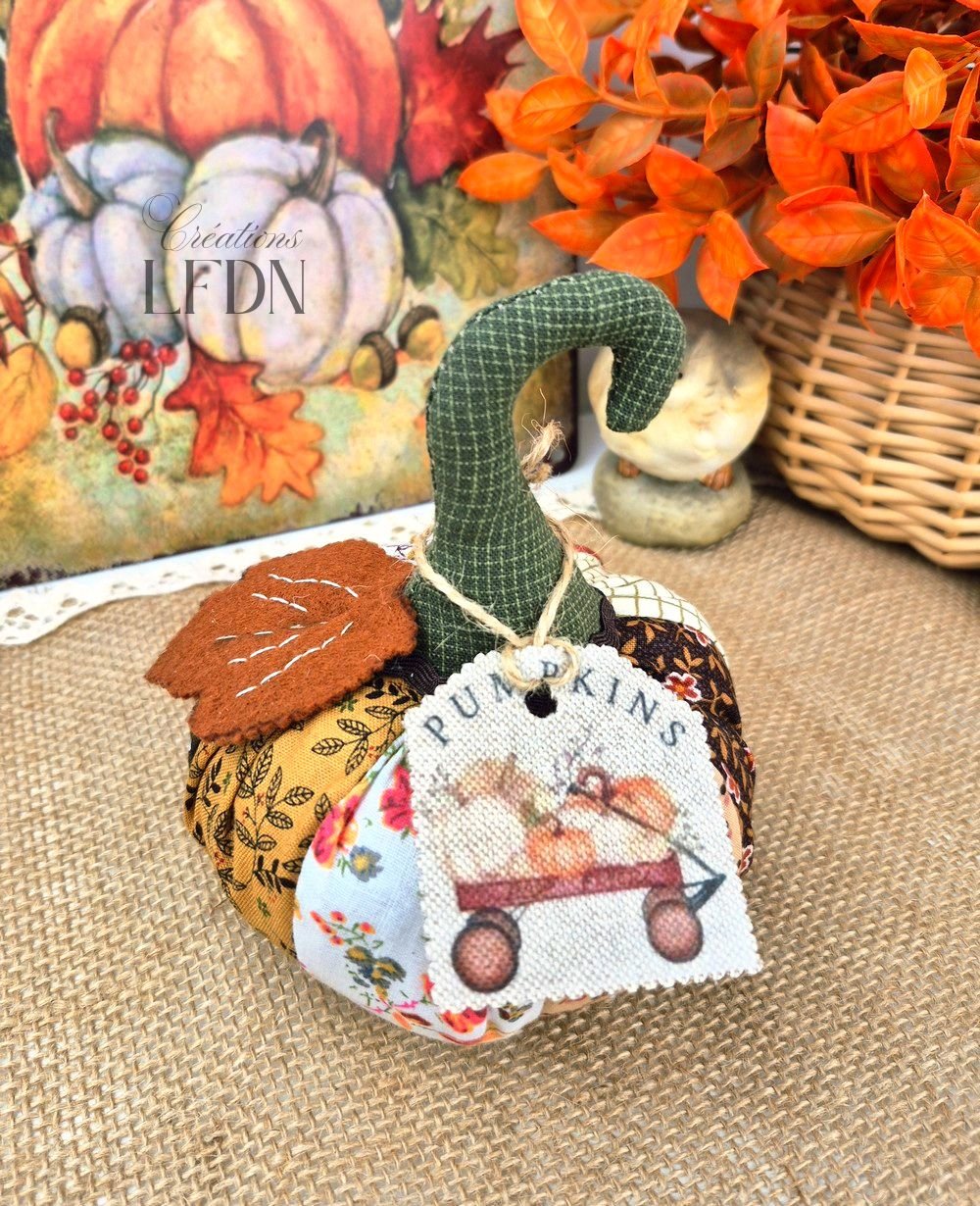 Découvrez cette citrouille décorative en tissu patchwork, une création artisanale unique qui ajoutera une touche chaleureuse à votre décoration automnale.