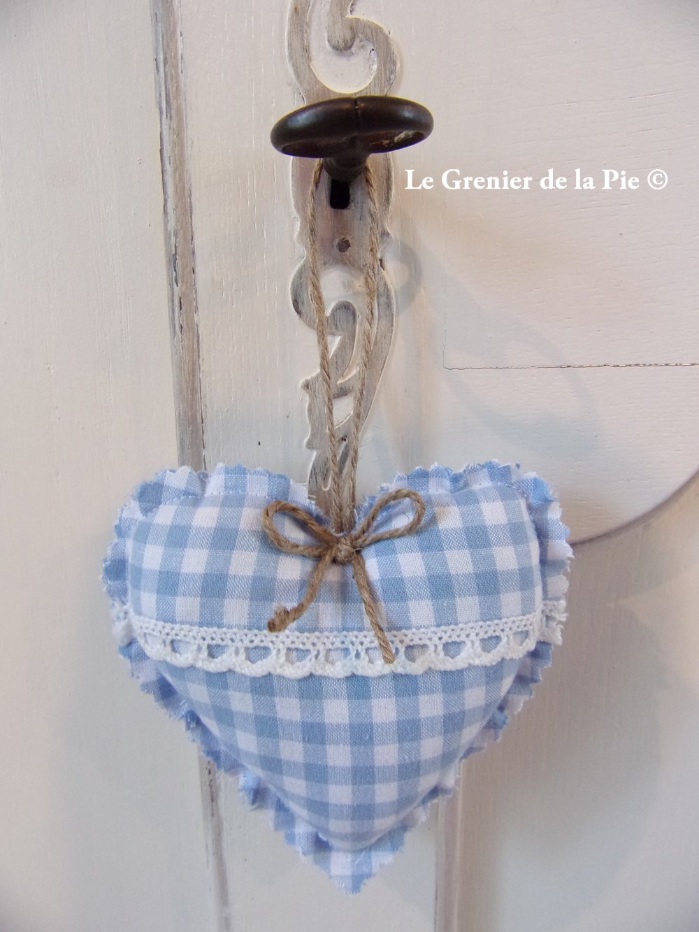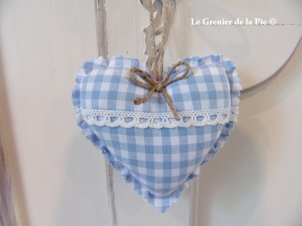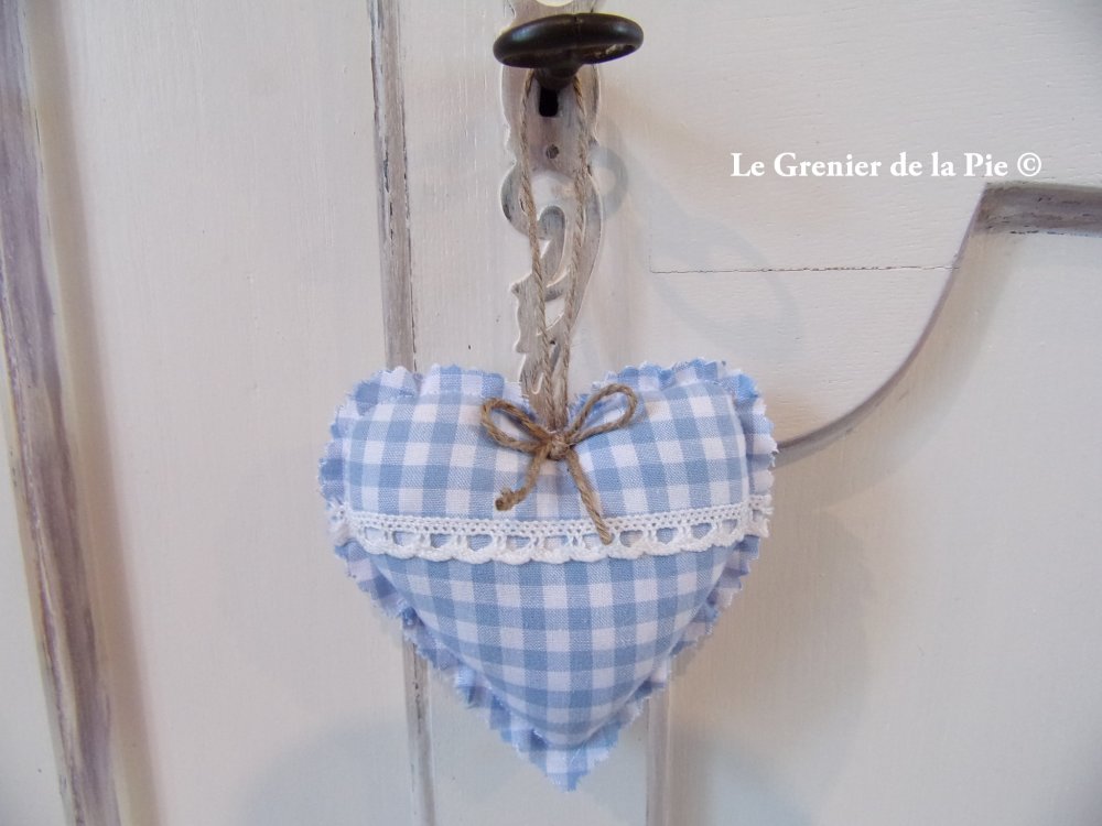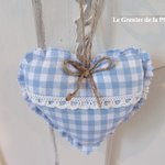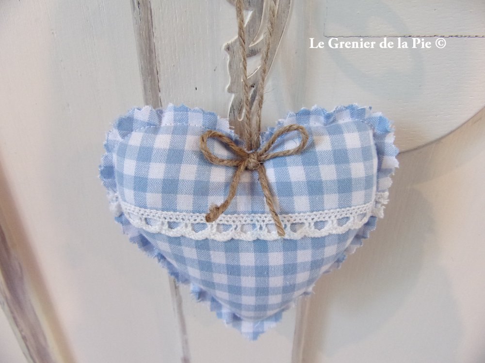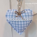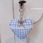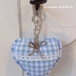 COEUR A SUSPENDRE EN TISSU VICHY BLEU CLAIR avec dentelle et noeud en jute