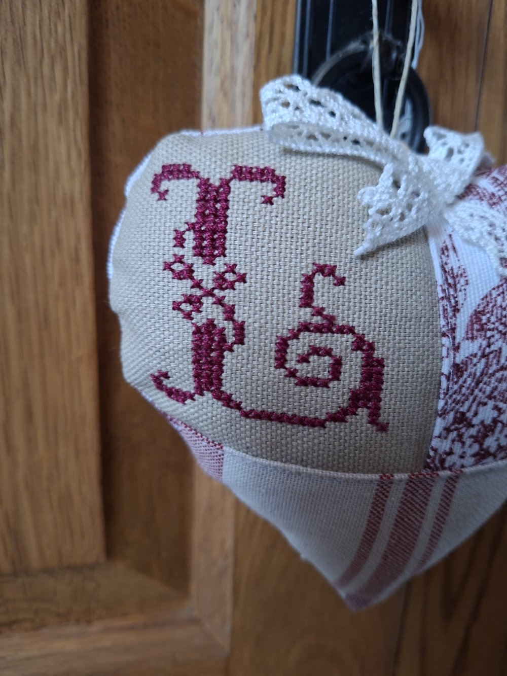 La lettre L est brodée aux points de croix, apportant une touche personnalisée et délicate.