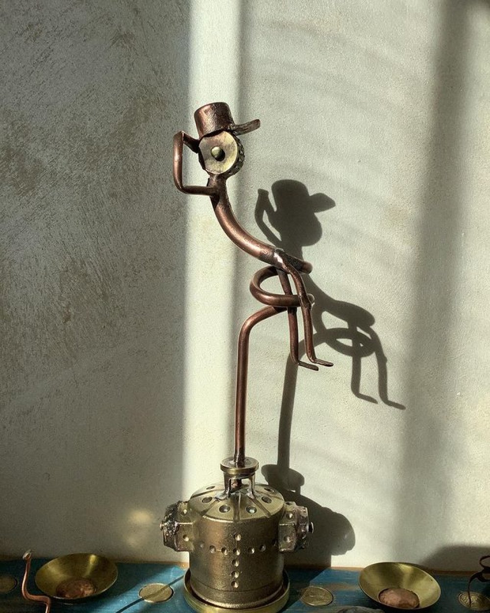 Le cuivre, le laiton ou encore le bronze plus rarement ; je récupère, frappe, scie, soude afin de créer toutes sortes d’objets et personnages.